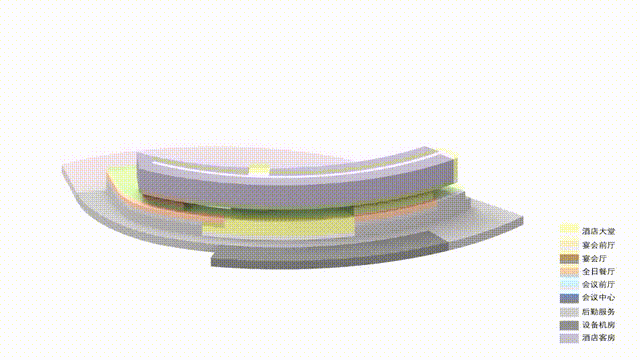 按功能分区,南侧体量为酒店,整体呈西低东高之势;北侧为酒店式公寓,西高东低,两个体量动态平衡,循环往复,生生不息。