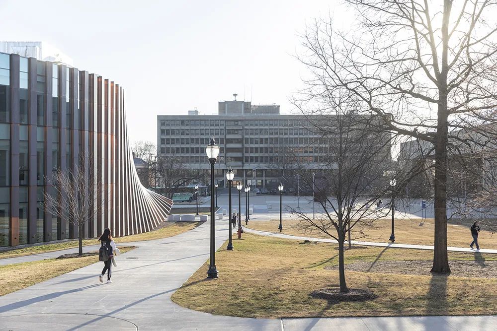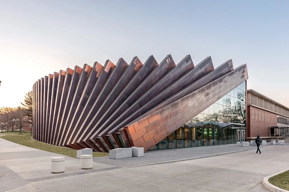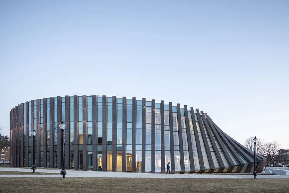Prominently situated on Haigis Mall near the entrance to the campus, a dramatic triangular glass entrance created by a domino-effect greets students. The building exterior is wrapped in straight, vertical pillars that gradually slope downward, creating a distinct appearance without any curved elements.