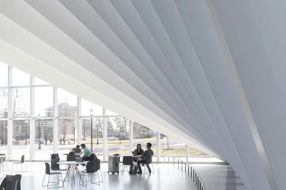 非同以往的设计思考,商业创新中心建筑是基于其原有学院建筑的连接与延伸。该栋建筑与始建于1964年的旧有教学楼自北侧相连,经由环形建造延伸最终在东侧再次相接。在新与旧的衔接下,学生与教职员工得以在两栋建筑中无障碍畅通,且巧妙的设计和创意的造型成为伊森伯格管理学院的独特标签。