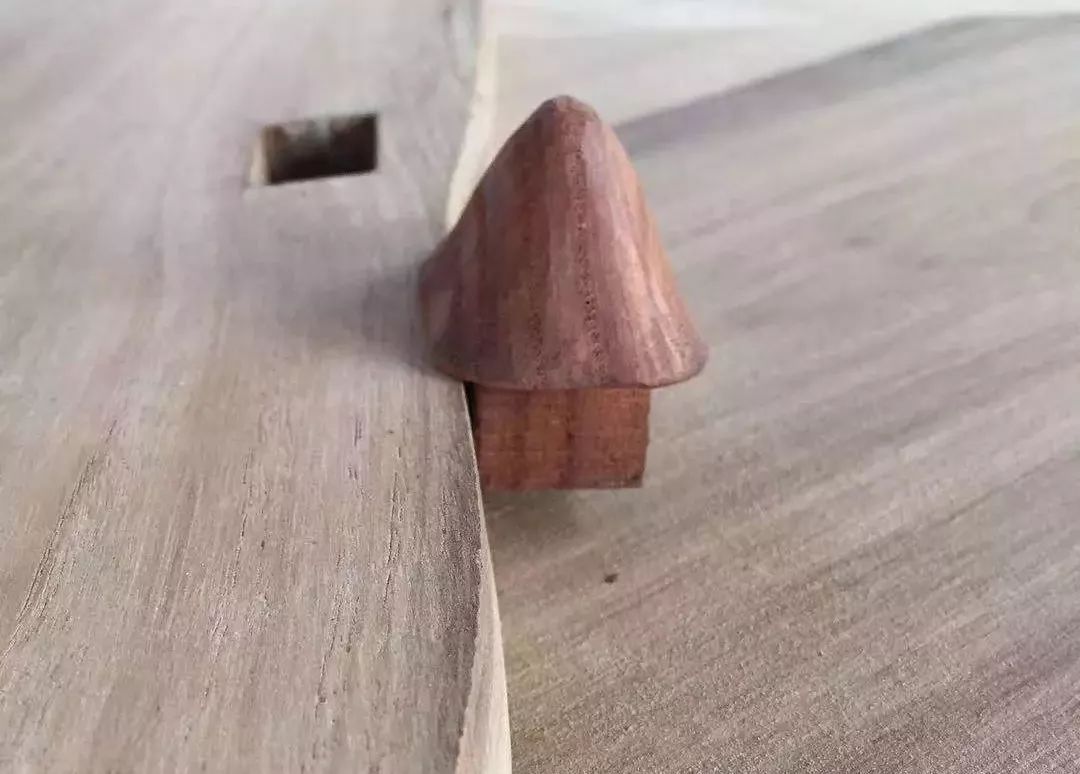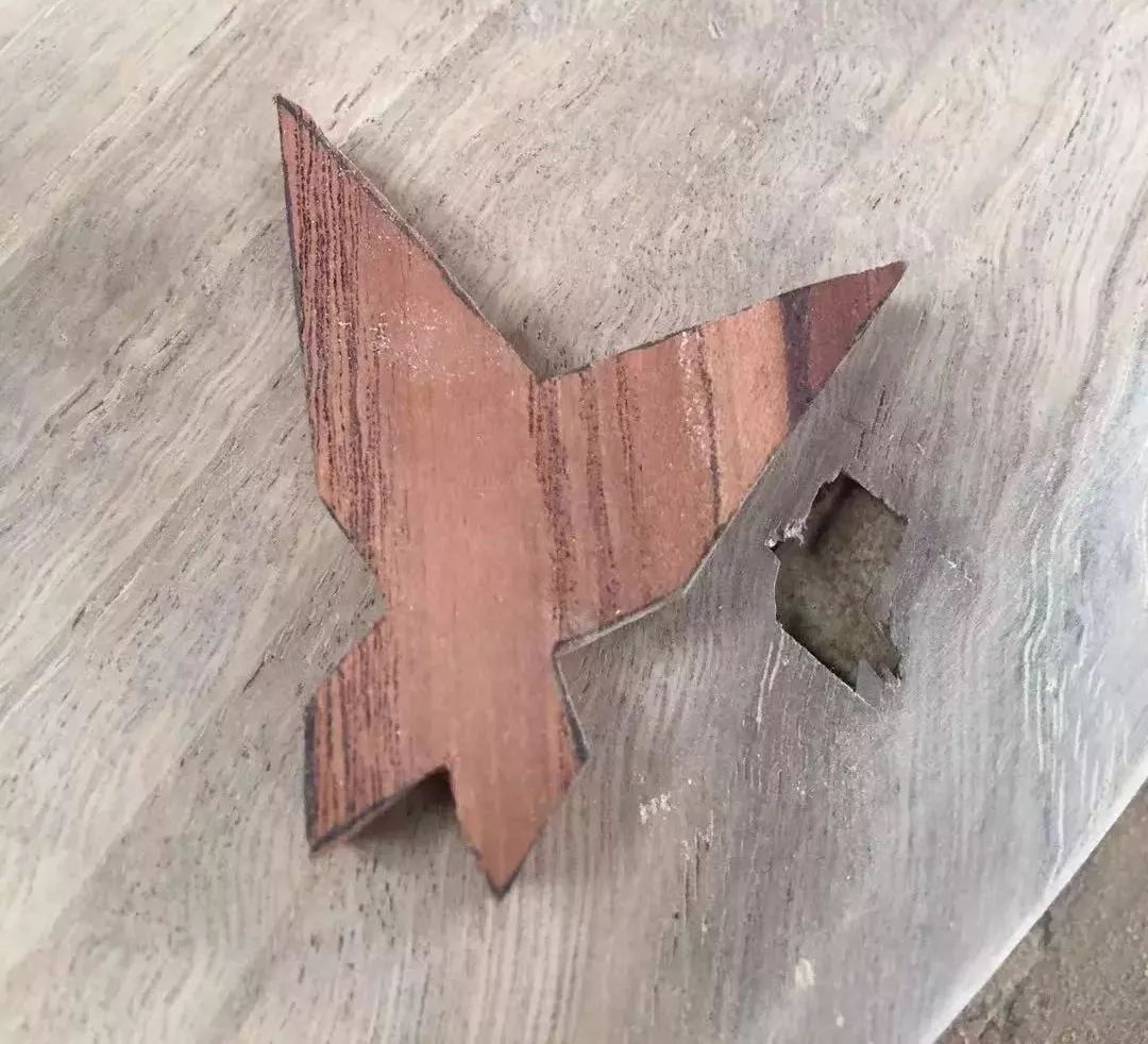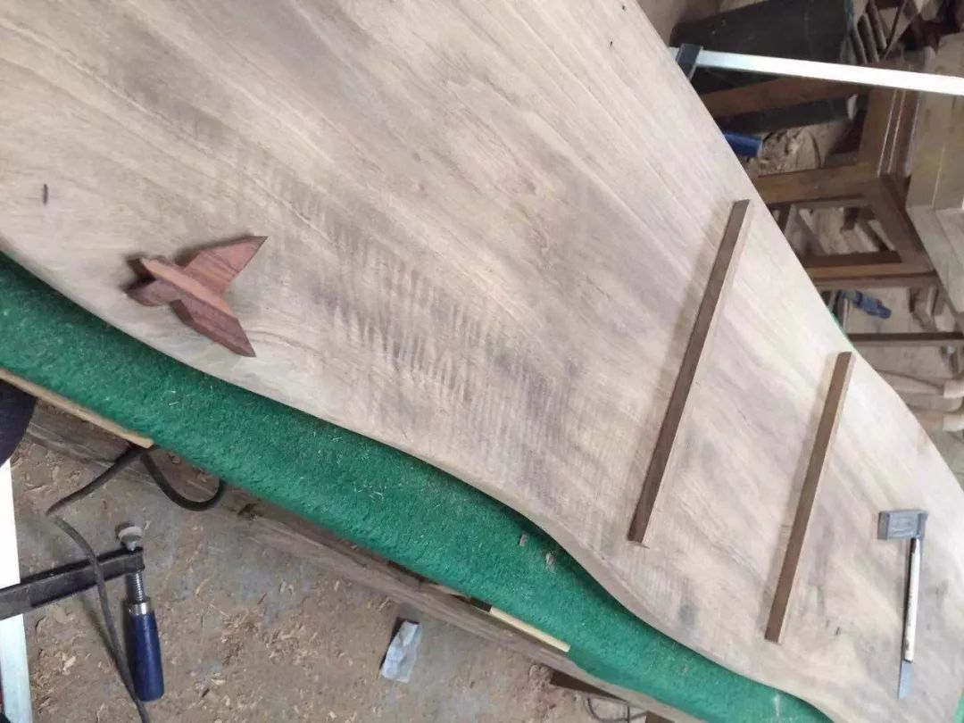 由于案板古旧,板身已被虫蛀坏。设计师请工匠将一只简约的木雕蝴蝶覆盖在蛀洞上,增加美观与雅趣,也给予作品更多生机。