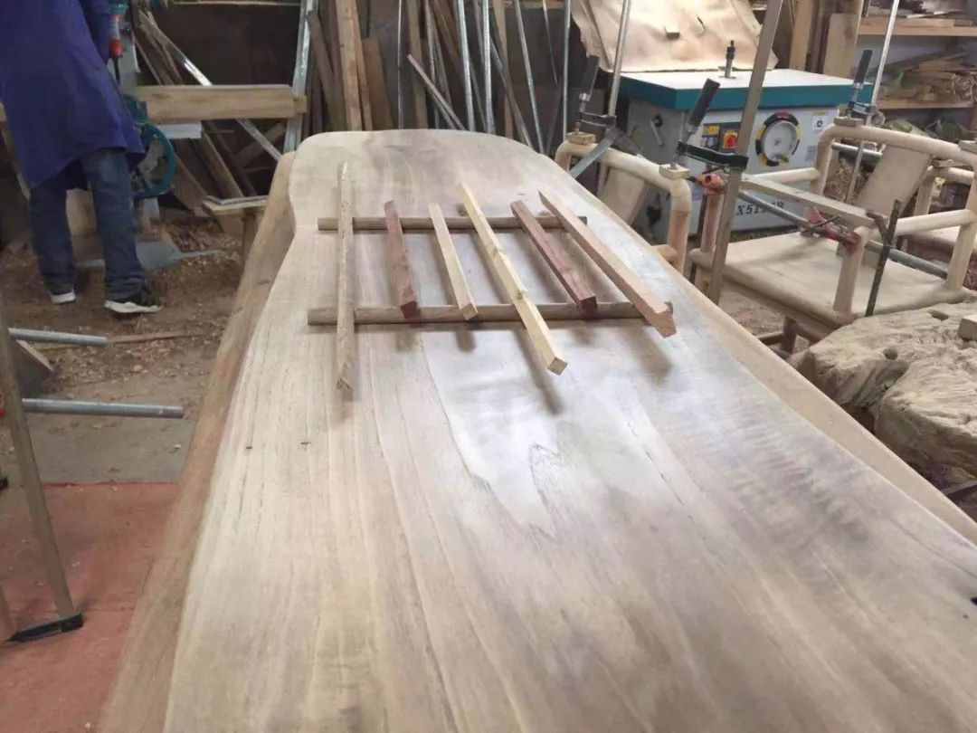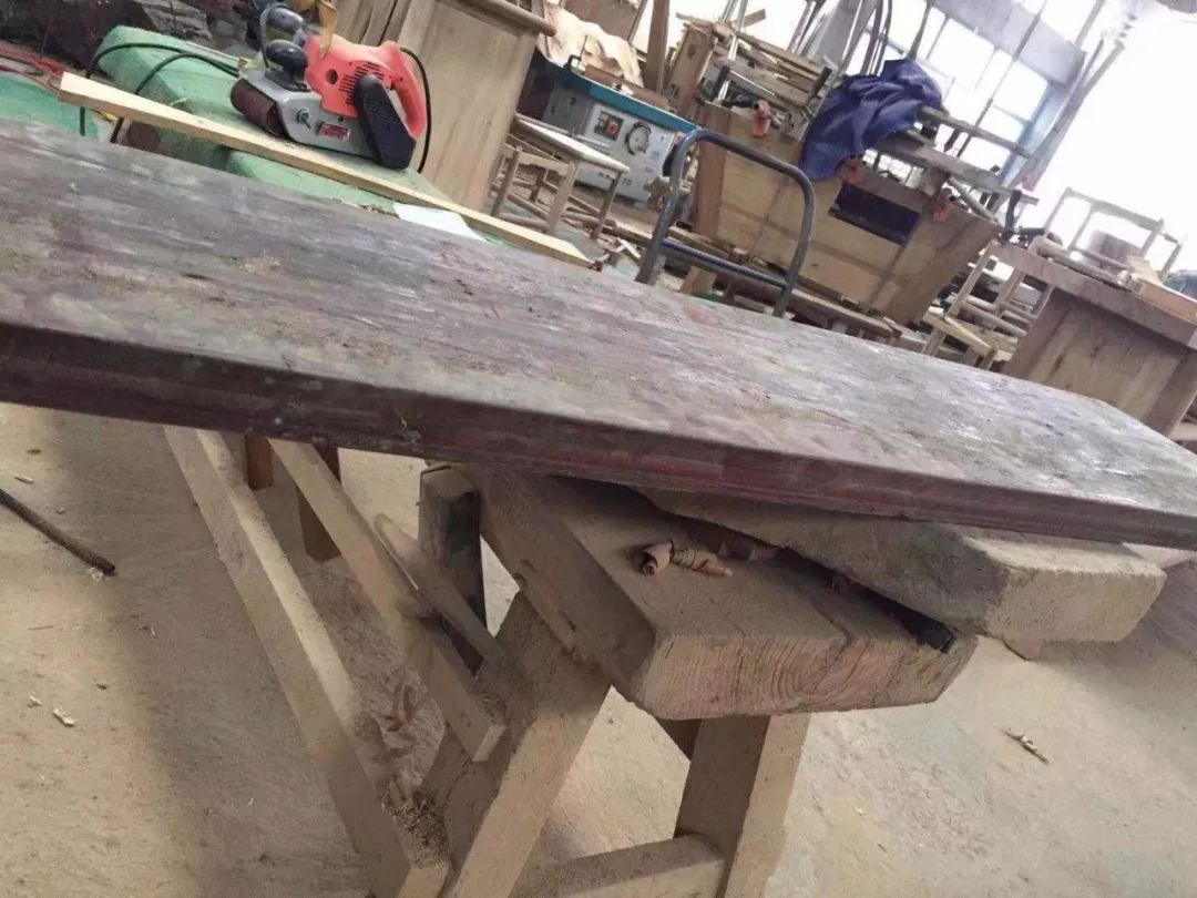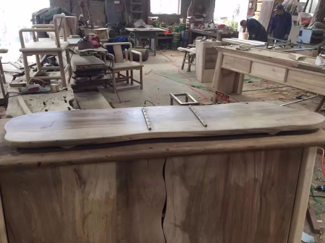 整体装置的托板为一块废弃案台改造。案台为木质,四个桌脚早已腐烂。设计师请工匠将其重新打磨、刻画曲线,在原本桌脚与案板的连接处放置稳定脚座。