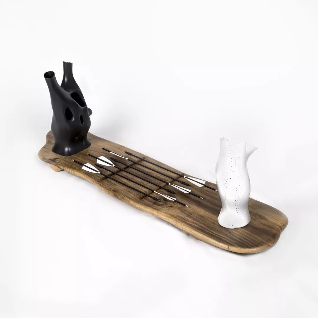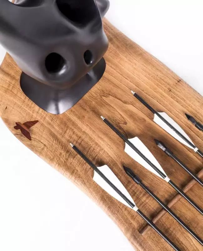 设计师参考古代箭矢制作过程——打磨箭簇及箭座、定位箭羽,同时保证其呈逼近直线的曲线状态。箭身采用碳纤维材料,轻巧强韧。整体箭支注重比例,返璞归真。