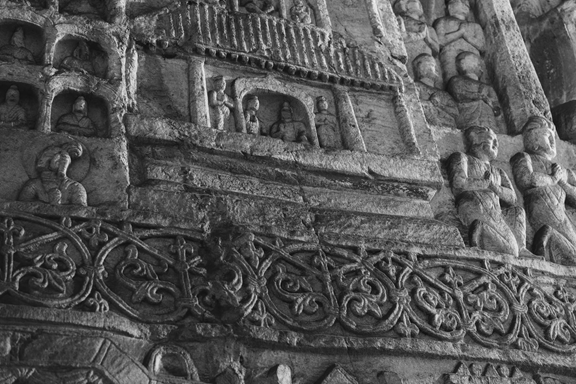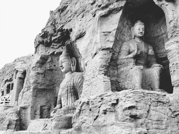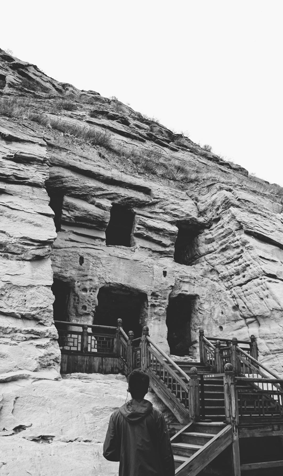 云冈石窟依山而凿,自然之石在延绵山体中被赋予了精神性。自然,神,人,合身为一。大大小小窟龛做为一个整体横向延山脉展开,也随形于自然山体的高低起伏,呈自然之态,借山之势,显山门气象。