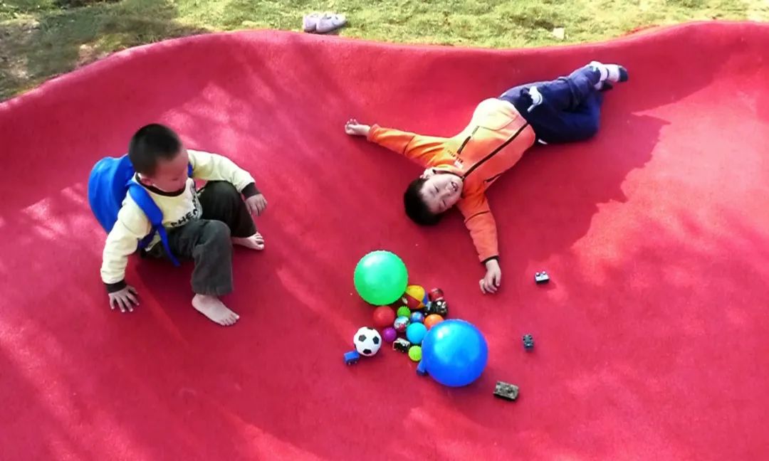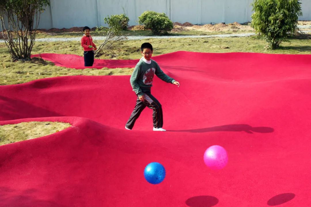 脚印周围,围合花草树木,形成一个迷你乐园。同时独特的怪兽脚印造型,高低起伏的地势差,吸引了周边的很多小朋友来这里奔跑、游戏。