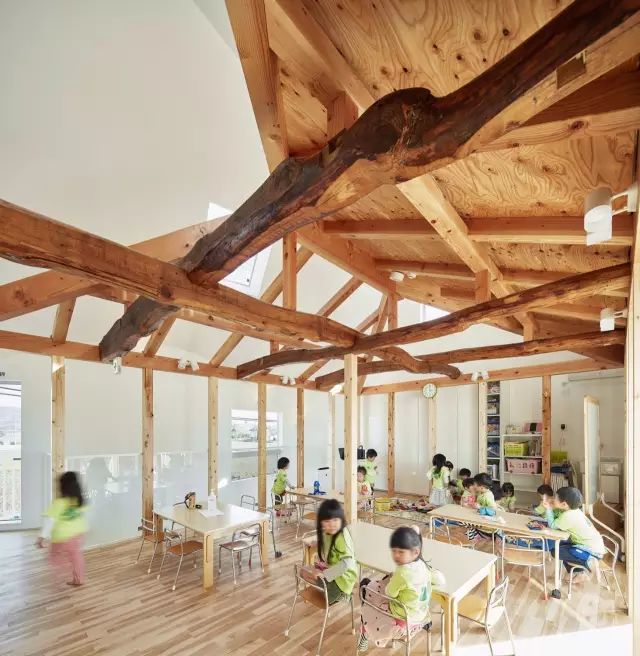 新的“帐篷外壳”和旧有的木结构造就了有趣的室内空间。建筑一、二层为小朋友们日常学习、活动的场所,加上自然光通过屋顶天窗和四周窗户洒入室内,整个空间明亮通透,为孩子们的日常互动增添几分亲切和温暖。