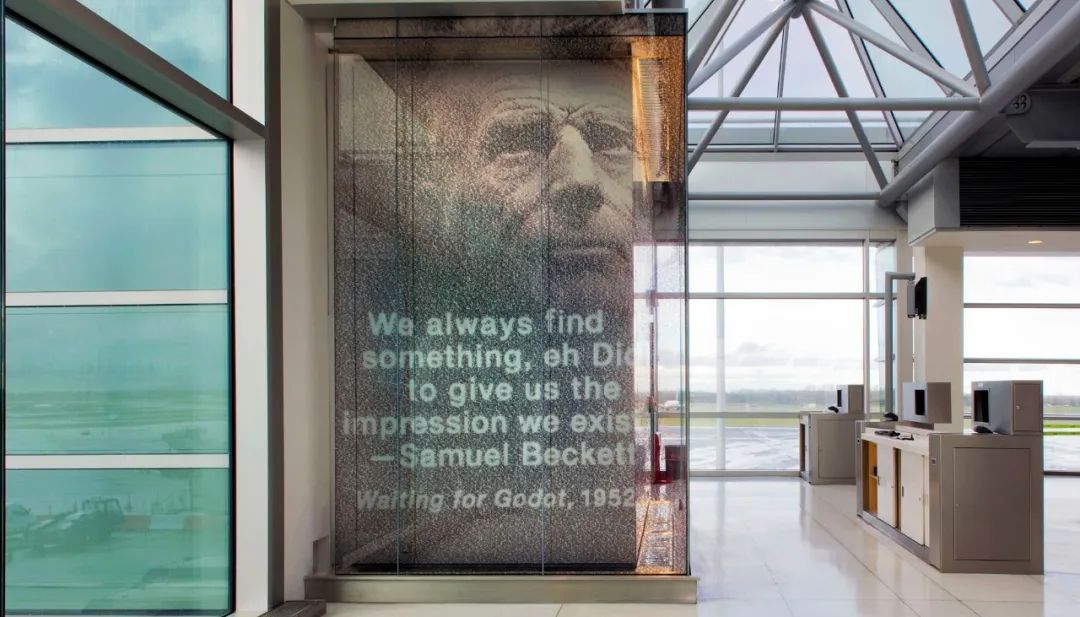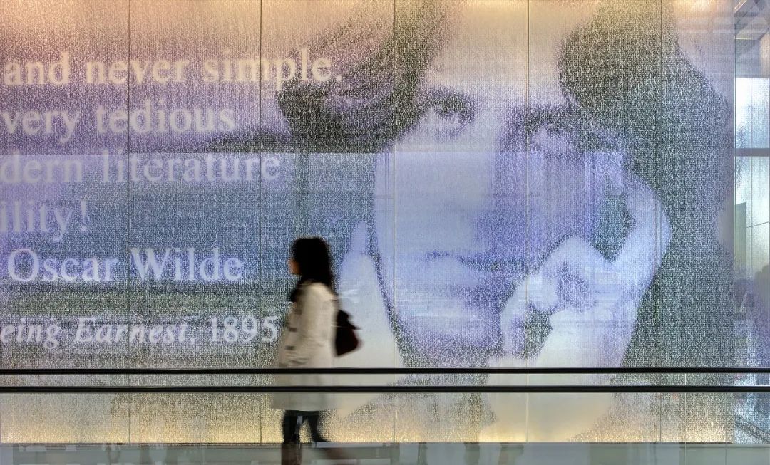 每幅肖像由各个作家最富盛名的作品层叠而成,环境图形会随着观赏角度的远近大小而变化:都柏林机场——D登机走廊 © SOM
