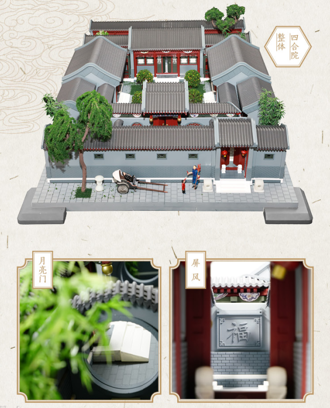 此次机工文创上线的是“古建拼装园梦系列”中的四合院“内宅”及四合院其他单体建筑,我们以北京四合院的建筑艺术及独特的文化特征来进行构思,通过精雕细琢的微缩模型,去推广我们共同热爱的这座城市。