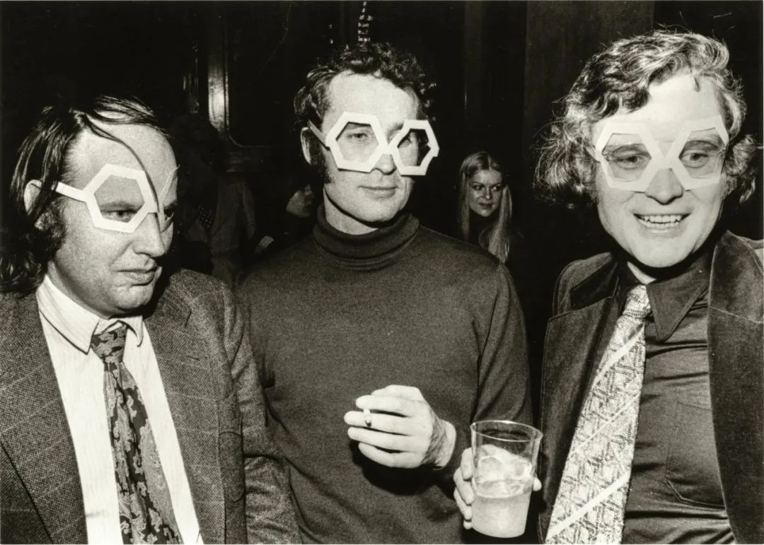 戴着泰格尔六角眼镜(作为开幕派对入场券)的 冯·格康,玛格和尼克尔斯,1974年 © Otto Stark