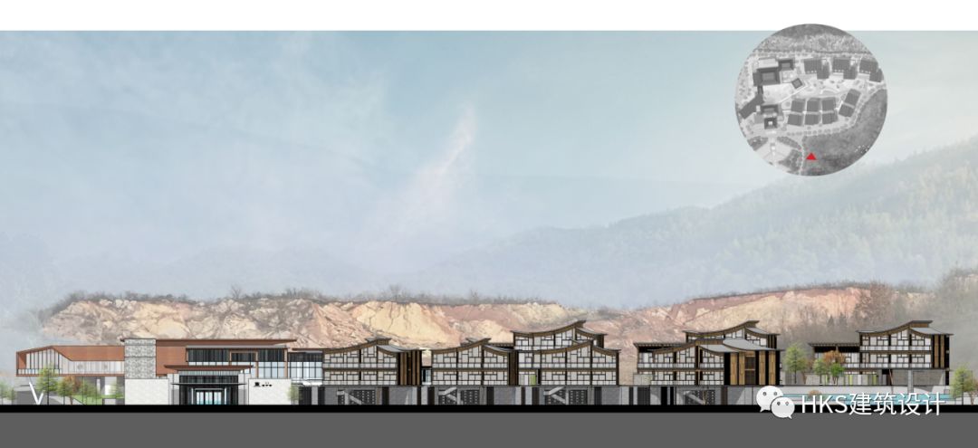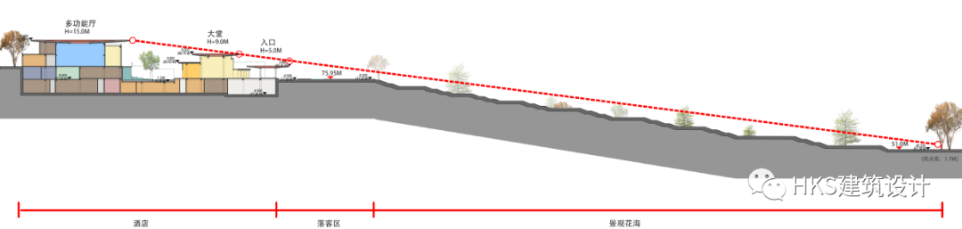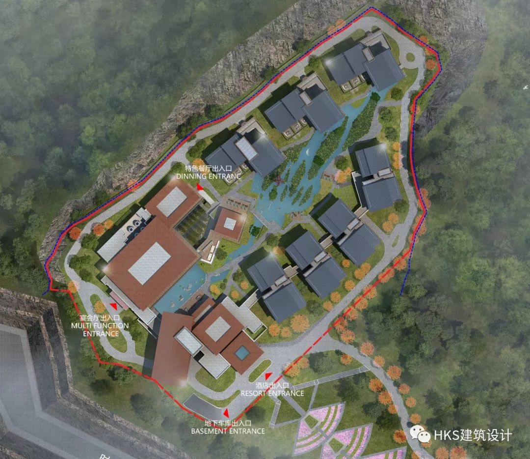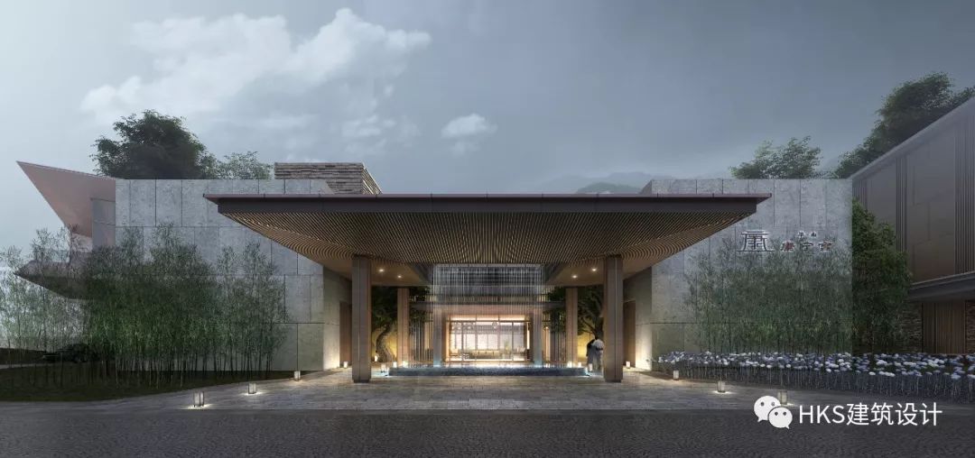 基地南边紧邻大片花海梯田,客人通过蜿蜒道路到酒店落客区,然后通过柱廊形成的灰空间到达大堂,大堂直面中央水庭。