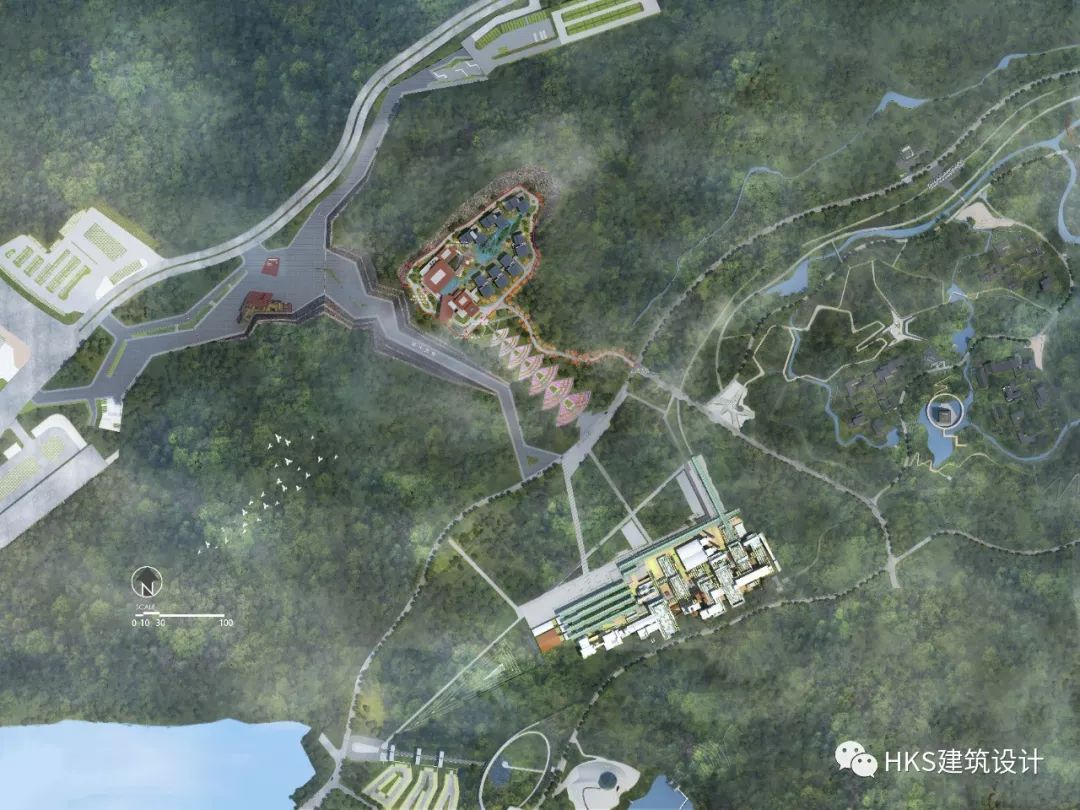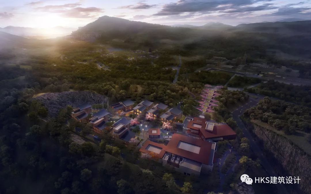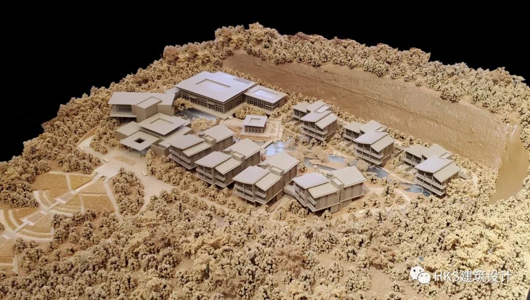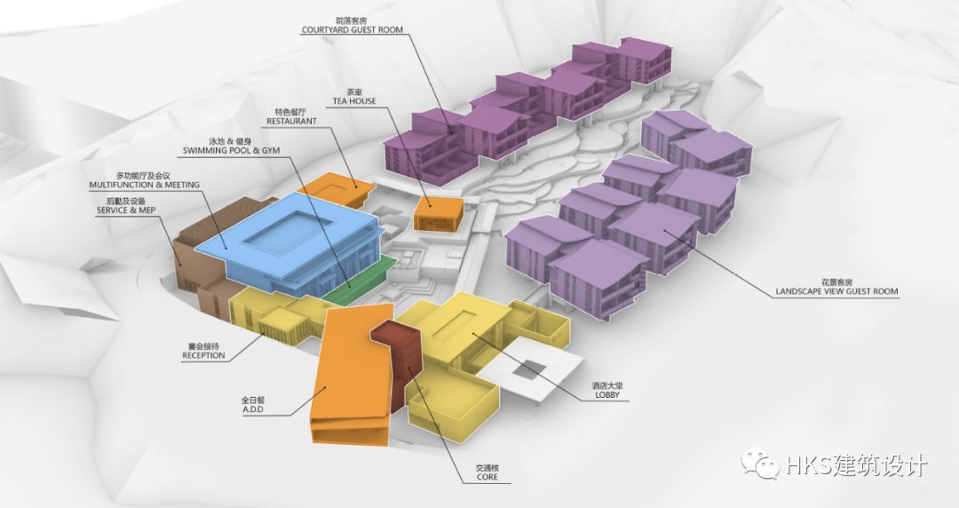 秉承“都市桃源”的理念,将建筑体量尽量分解,结合最佳的景观视野布置公区和客房区域。建筑如同从地面自然生长出来的村落,错落有致,结合地形高差,使公区和客房均能获得最佳景观资源。