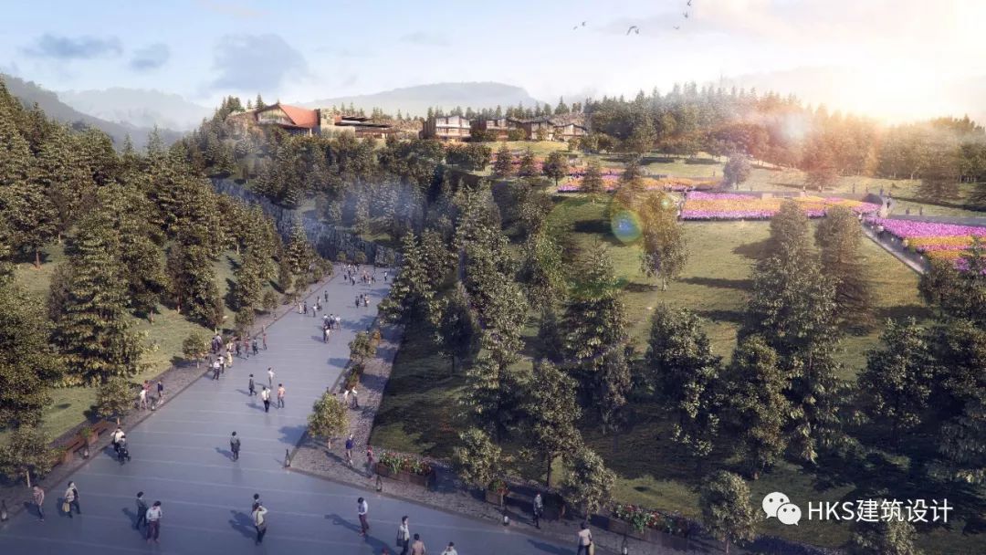 南边客房群如悬浮在山中,客房最好的视野面向花海。基地内部利用高差,后排的客房高于南边前排客房,并通过景观水系联系其南北区域的空间布局。