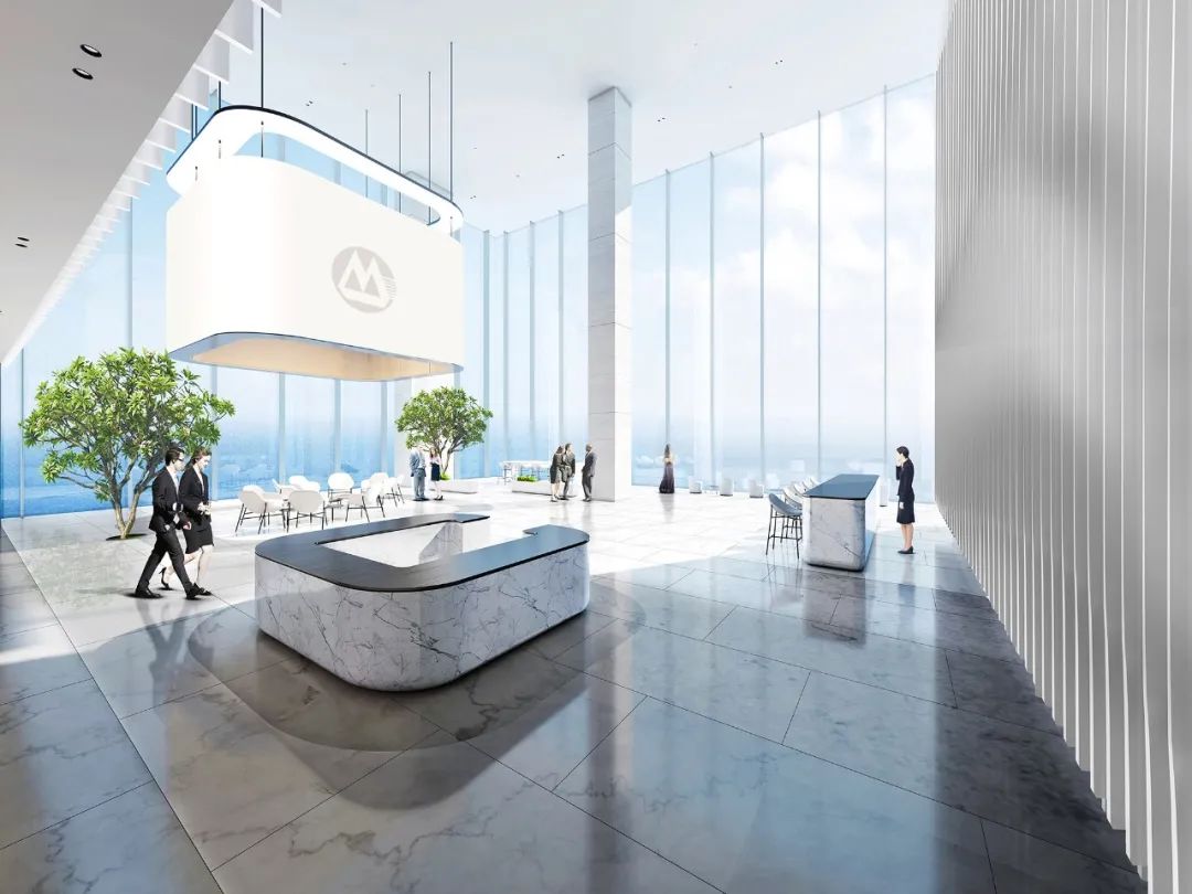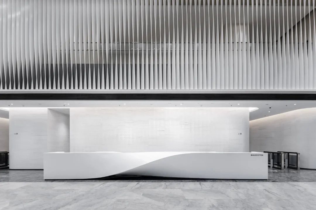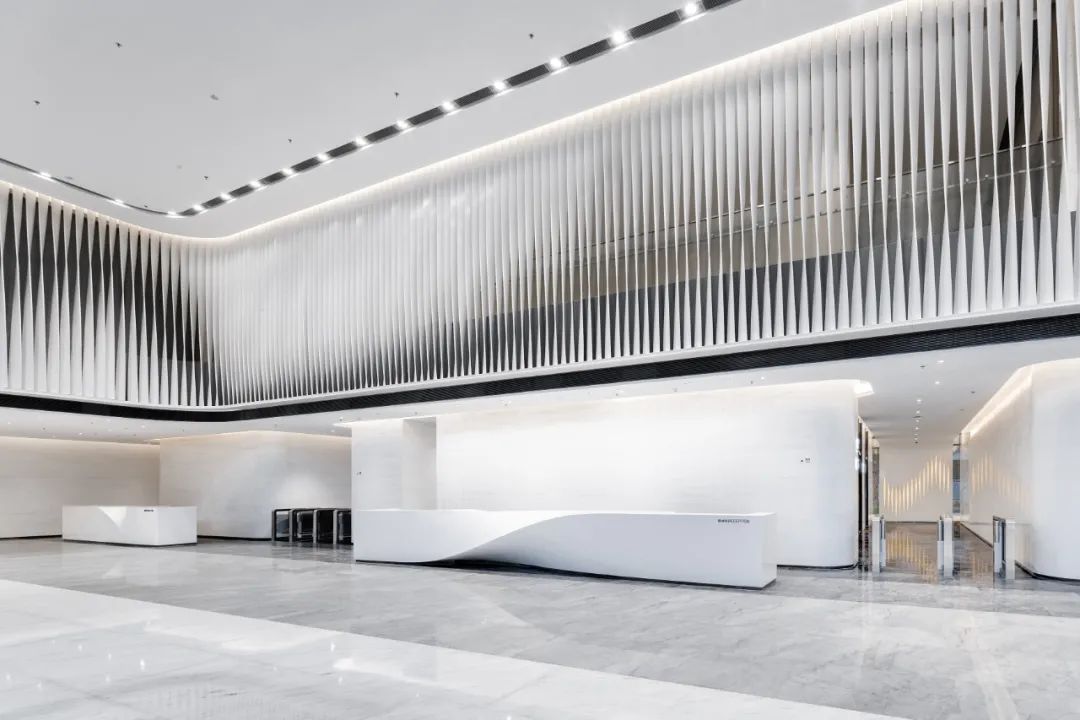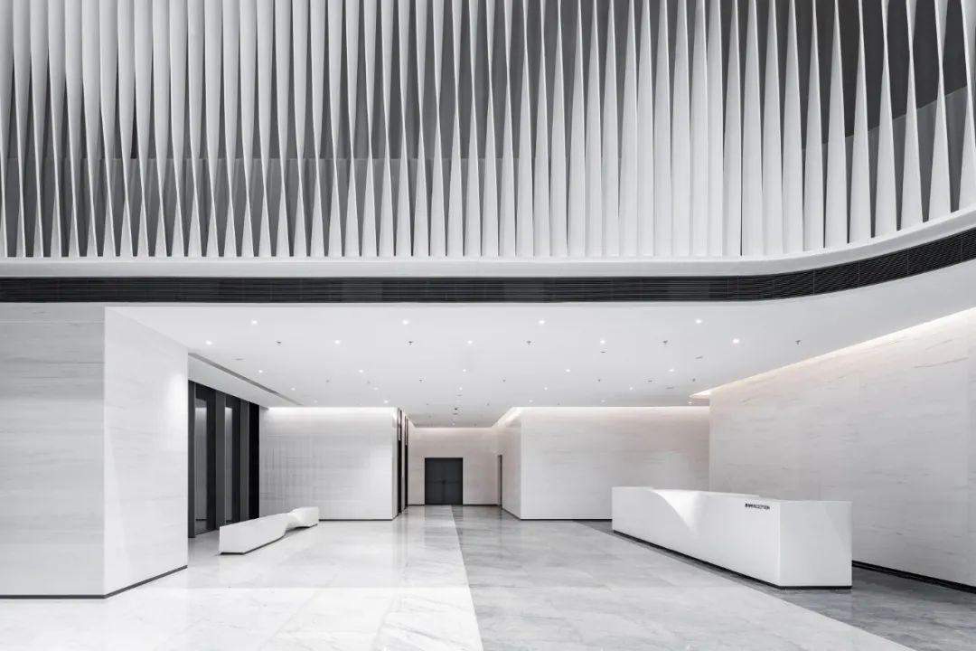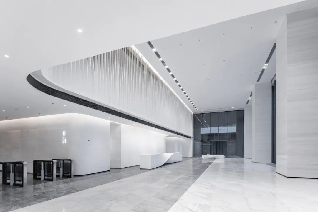 三层楼高的凌空大堂是总部办公室的动态入口,位于每个楼层的角落以最大限度地提升视野。首层大堂的纯色语言通过艺术屏幕和磨光面复制到凌空大堂。