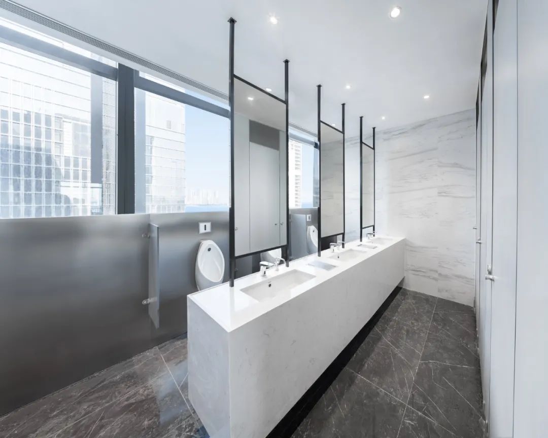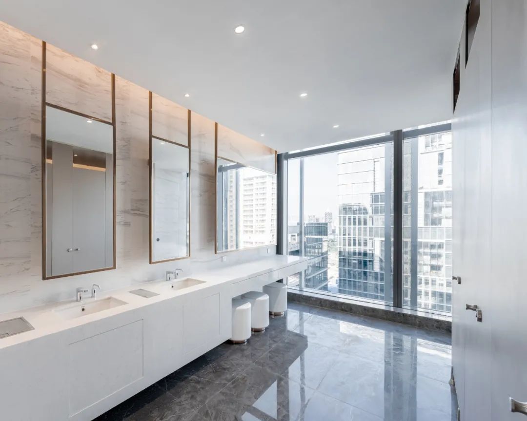 盥洗室包括特色岛形洗漱盆、旋转镜、看到景观的小便器、景观梳妆区和印有图案的洗手间门。