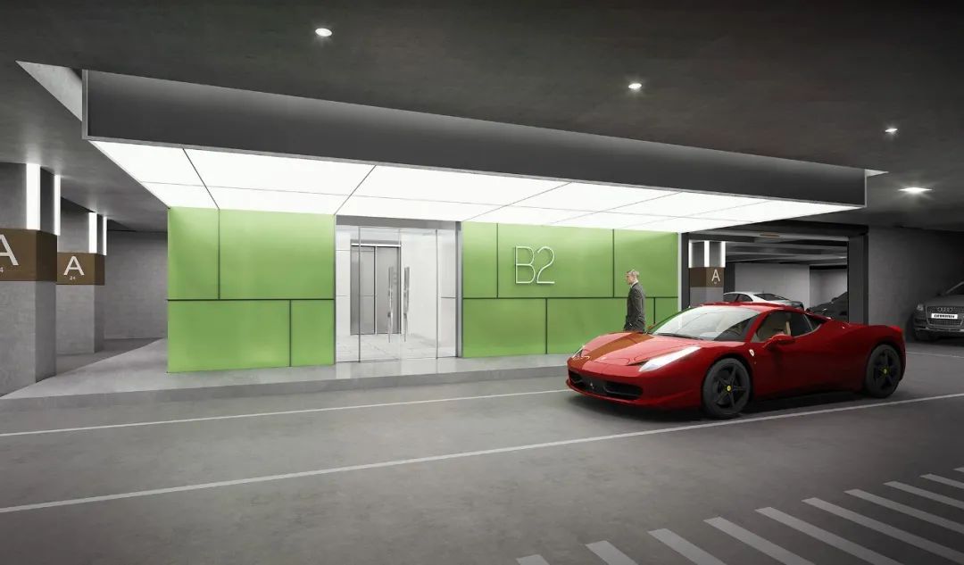 车库大堂是一个重要的二级办公楼落客区和入口。它被设计成停车场内的绿色标志,由一顶巨大的背光顶篷形成一个接待入口。顶篷由背光天花板所构成,遮住了大厅有限的空间。