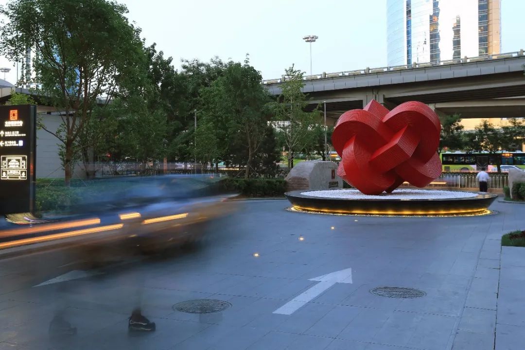 经过多方考虑,在2016年的时候,甲方提出了改造的需求,我们根据客户的诉求把整体的铺装进行了一些修缮。同时我们建议可以放一个标志性的雕塑,让酒店的文化品位得到提升,也让入口的标识性更强一点。现在酒店用了一个非常好的作品,是一个三颗心造型,神似中国结的雕塑。之后,这里就成为了从东三环路过记住银泰的一个标识。