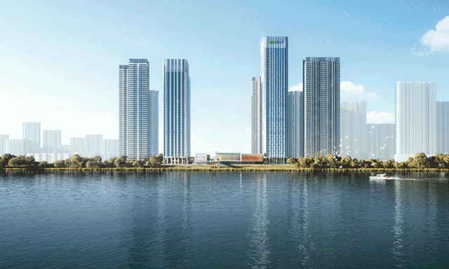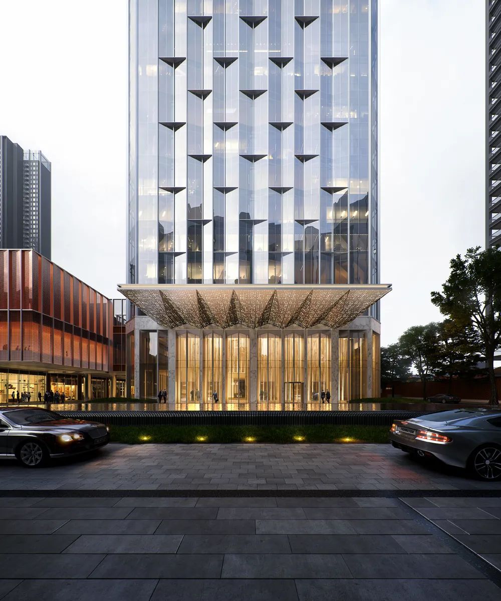 沿江伫立的两座商务办公塔楼延续了一致的建筑语言,设计选取“章”为概念, 以玻璃幕墙与石材背衬相结合方式,呈现出如同玉石印章的建筑轮廓,与红印相呼应,一左一右,一高一矮,错落有致的天际线塑造出隽永的青山江岸新形象。