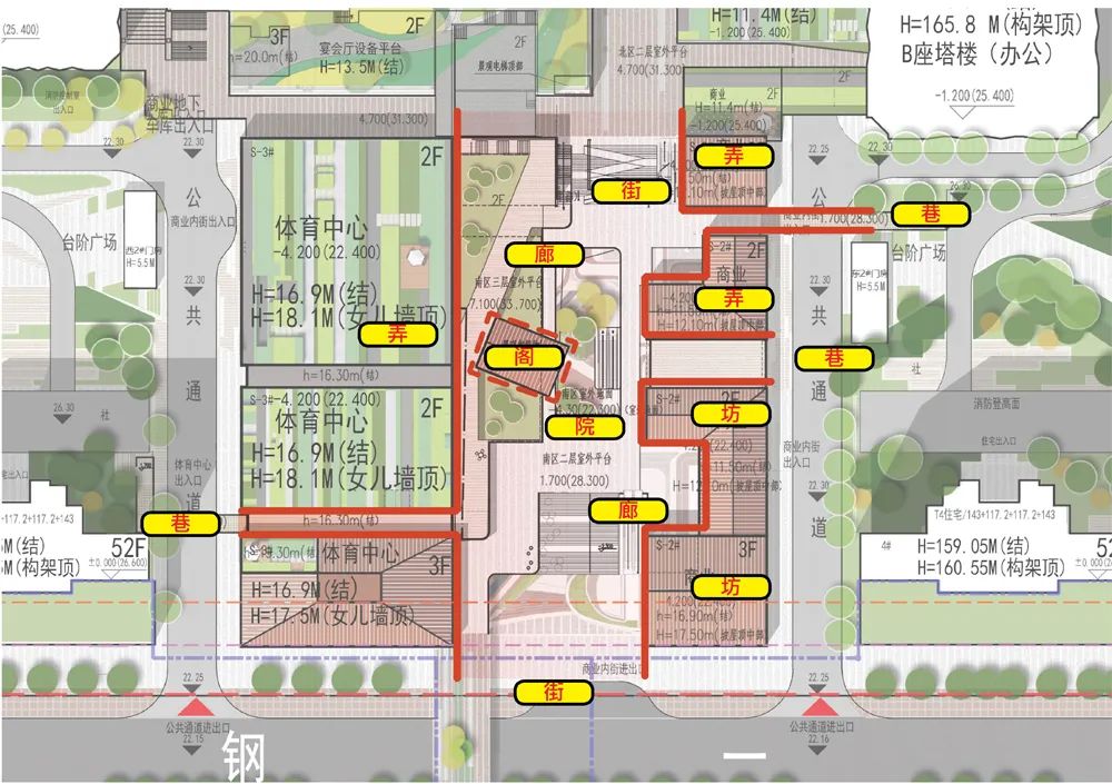 Aedas充分尊重原城市设计原则,在一链、一印、两章、两坊的全新格局下,以商业之章、塔楼之印,保留武钢囍印肌理,多维度传承武钢精神,将经典的大院社区空间引入当代商业生活方式。