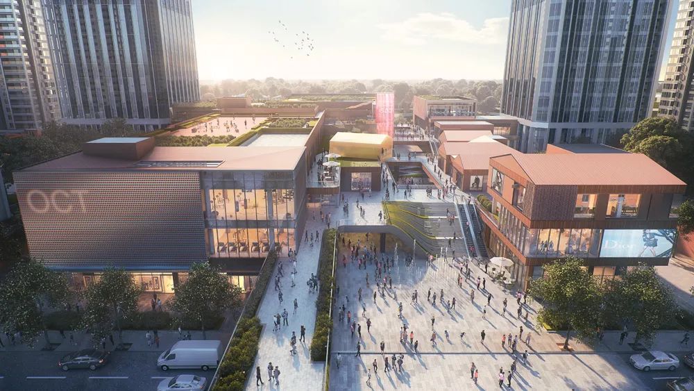 同时,设计通过空中连桥构建不同业态以及不同地块间的连接,在纵横交错的建筑体块开口间, 以尺度宜人的街道,为人们提供了视线的延伸和林荫步行体验,一同打造便捷立体的复合空间,激活片区。