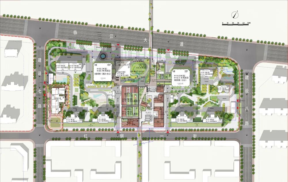 设计保留原城市设计的轴线结构,通过一条贯穿南北的中轴线连接临江和街坊两个高价值城市空间。住宅塔楼依次布局于中轴两侧,形成居住生活的东西两坊;奢华酒店和超甲级办公的商务塔楼沿江设置;而容纳会议中心、体育中心和商业街区的休闲商业空间位于中部,作为整个片区的衔接。设计通过体量错动及朝向调整,让各塔楼景观资源最大化,尽享江景、坊景、院景多维度景观。