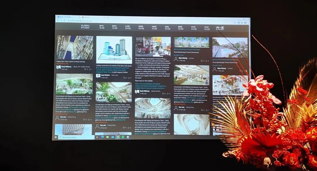 背景墙投影上展示的是伍兹贝格的“全球朋友圈”,上面有各工作室所在的地点和时间,内容是各工作室正在进行项目和办公室趣事。不仅能让员工们随时掌握公司的信息,也是企业文化的侧写。