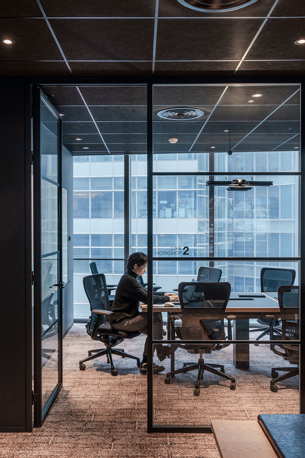 开放型会议室 坐落在办公室的最里面,挨着工作区。既有方便团队交流的长桌,也有几张单人沙发围坐起来氛围更轻松的,或者也可以选择在旁边的吧台上一边喝咖啡一边交谈,窗外就可以俯瞰宛如纽约“中央公园”般的绿地景观。