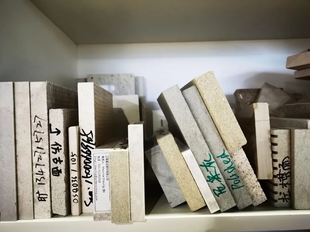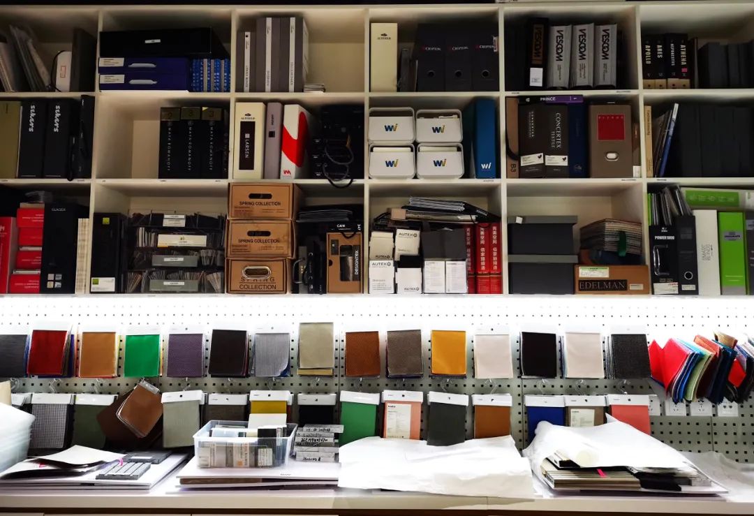在中轴线的中间位置,也就是核心工作区里,有材料间和图书馆。这里是设计师们使用最高频的空间,离工位也最近。陈列着的各种布料、石材让这个空间充满了「私人工作坊」的创意氛围,设计师们可以随时一起讨论选材。