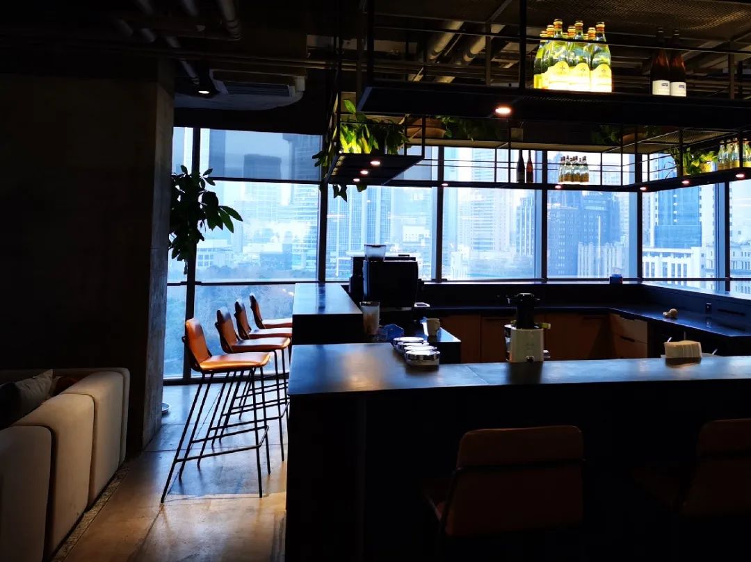 茶水间 位于“中轴线”尽头,黑色吧台、棕色高脚椅、角度合适的射灯和精心挑选的绿植将这里打造成了“办公室里的星巴克”。