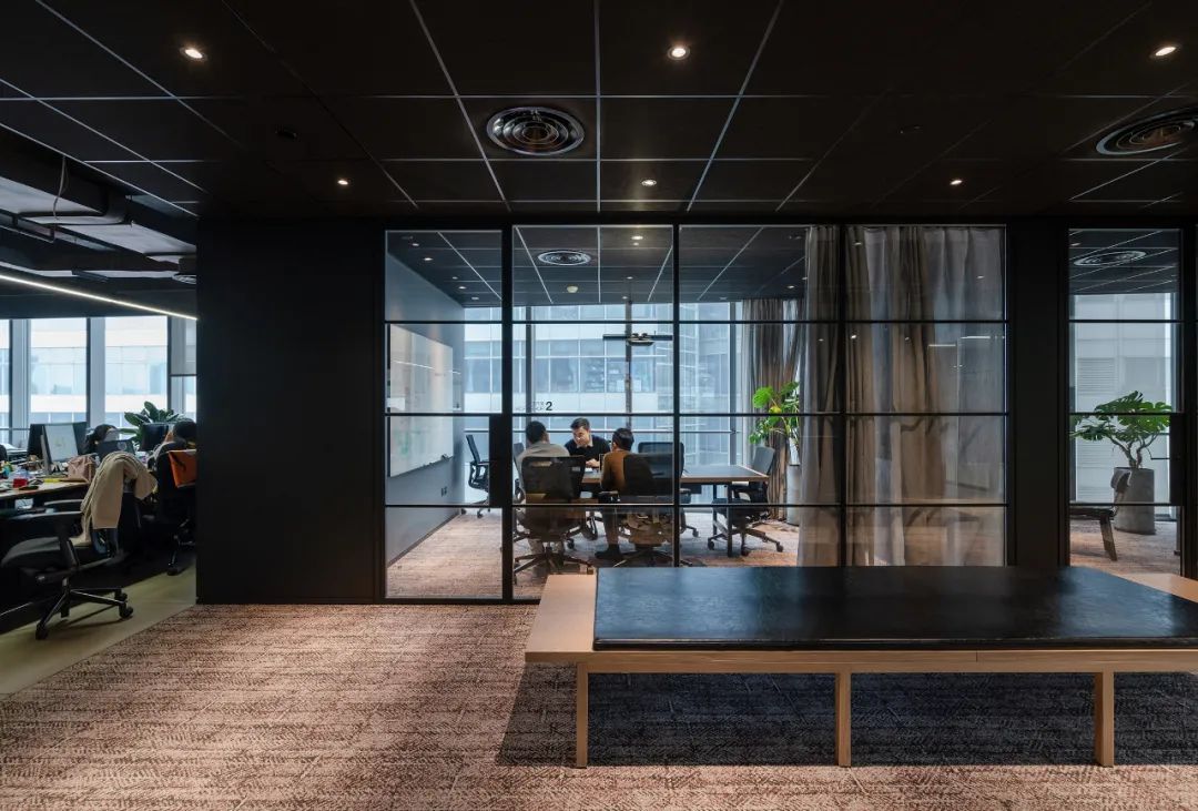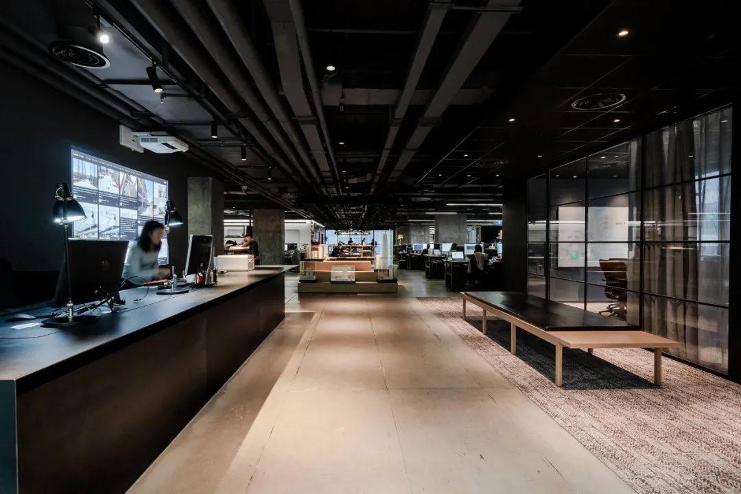 公司前台使用了现代酒店的设计手法 ,减少了「正经」感,更多的是轻松和舒适。深色背景台面和巧妙的光影配合,彰显着一家设计工作室的调性与空间美。