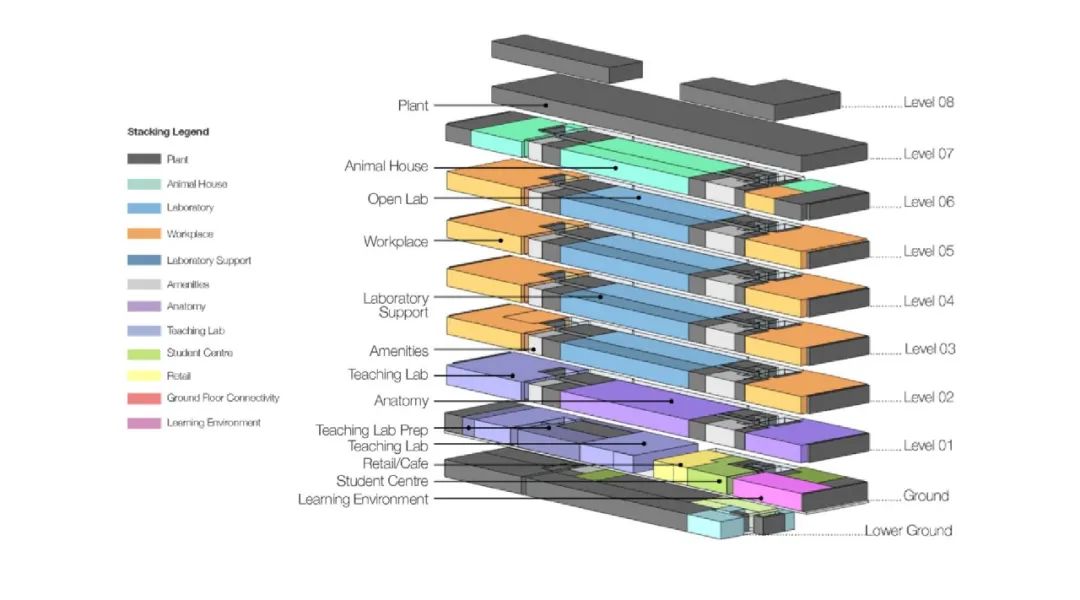 由伍兹贝格设计的新南威尔士大学生物医学中心是一个 8 层的现代化科研和教学实验室,为 550 多名教职员工、博士和 360 名生物医学本科学生 提供了一个充满活力的教育环境。