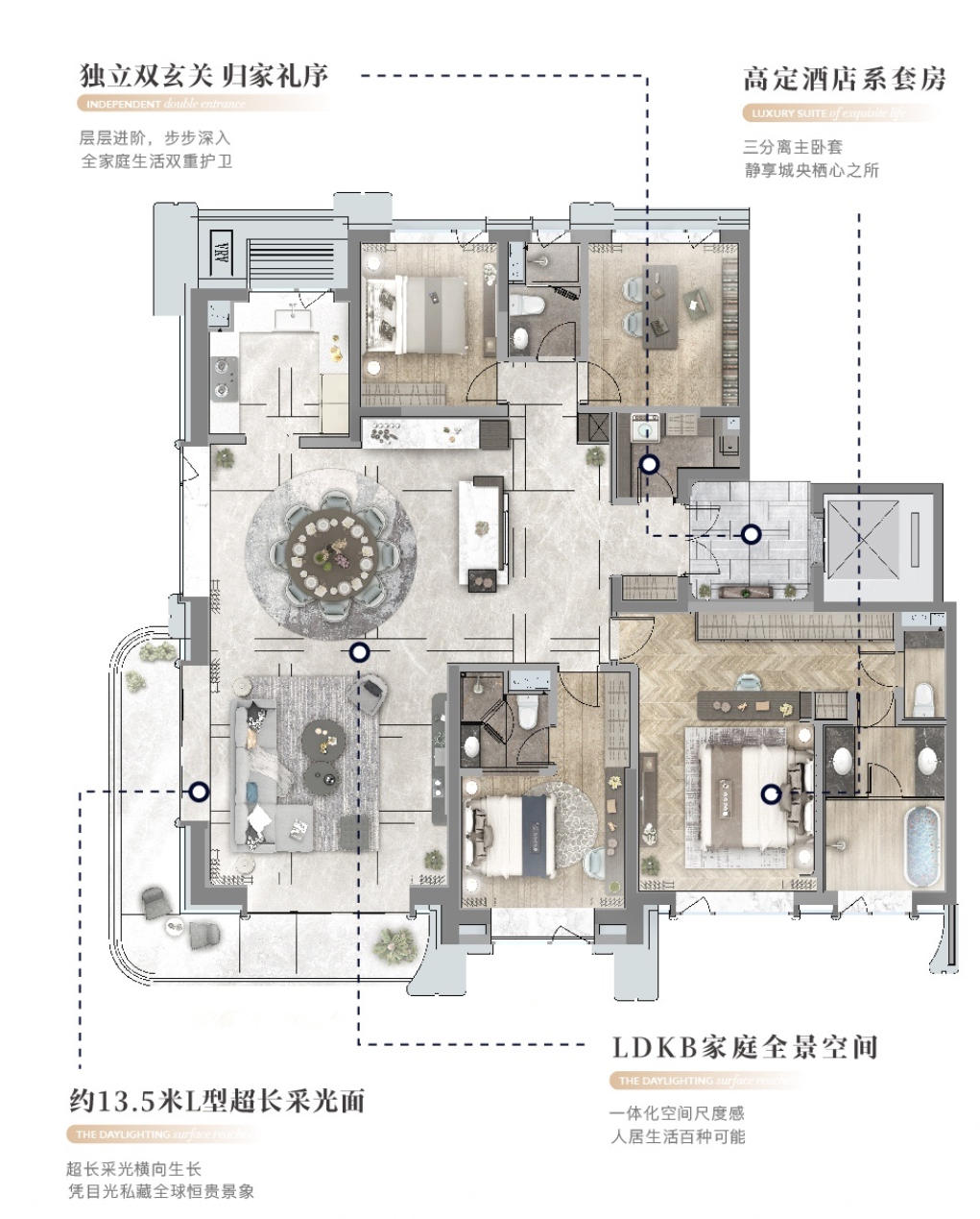 世茂北京天誉215㎡户型最大的亮点之一就是:把大量的精力和设计,都用在了“如何让业主获取更多的阳光”这一个问题上。