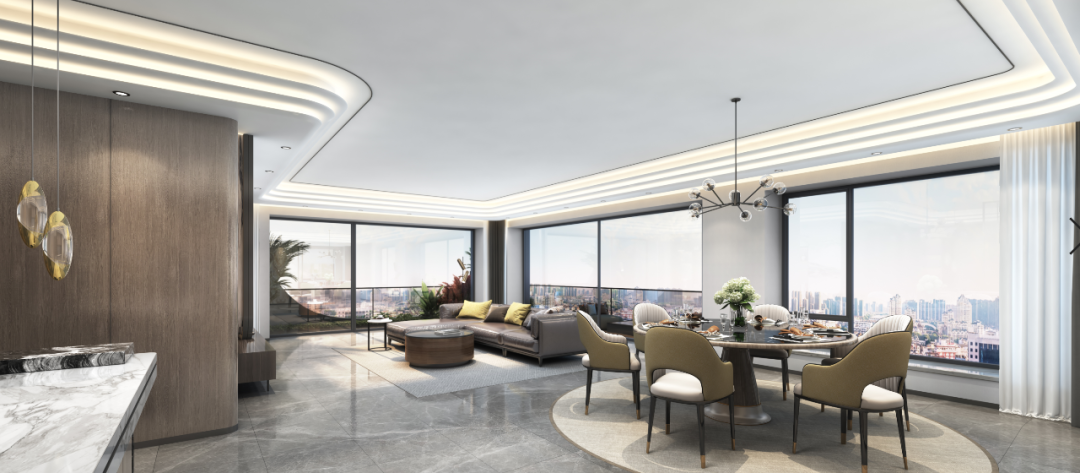 而且,世茂北京天誉的LDKB餐厅、 客厅、露台、厨房都采用一体化设计,通透明亮,空间可以自由切换使用,实现了270°无敌观景客厅的效果。