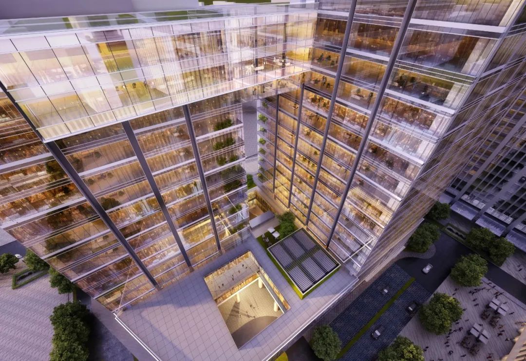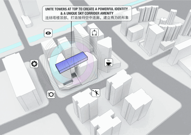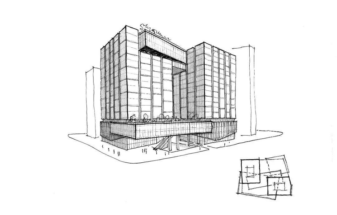 建筑以魔方为概念,通过扭转的形态,将两座办公商办塔楼通过裙房互相联结。体量上轻微的角度旋转来营造出独特的建筑体量感和仪式感,一系列旋转错位的盒子相互连接而产生积极空间和消极空间: 积极空间是指容纳各种办公空间和其配套舒适的空间;消极空间则面向公共社区开放。