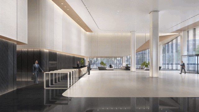 大堂的座位区将为使用者提供一个能放松等候的空间,运用温暖柔和的色调以及材质,可以与传统的空间硬材形成一种对比。这种设计将会为总部办公的使用者和其他租户提供更多空间价值。