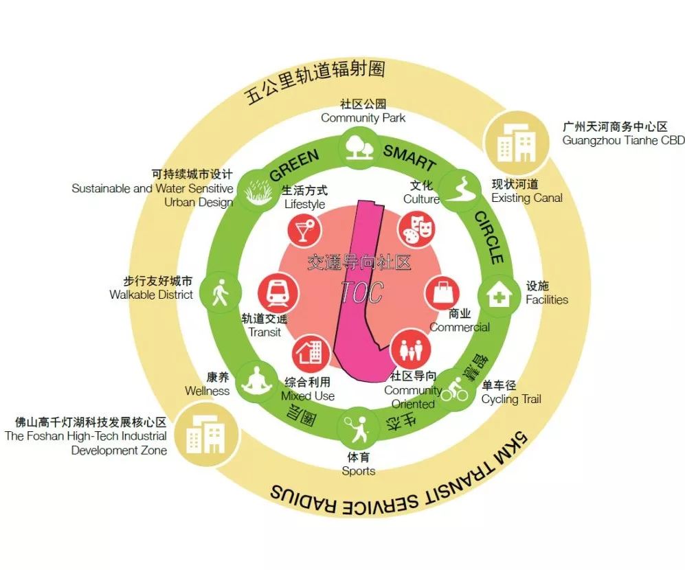 轨道辐射圈/ 连接枢纽周边 5 公里片区,通过公交绿色出行,吸引广佛沿线及天河 CBD 等四线人流/现金流,集聚广州西门户;