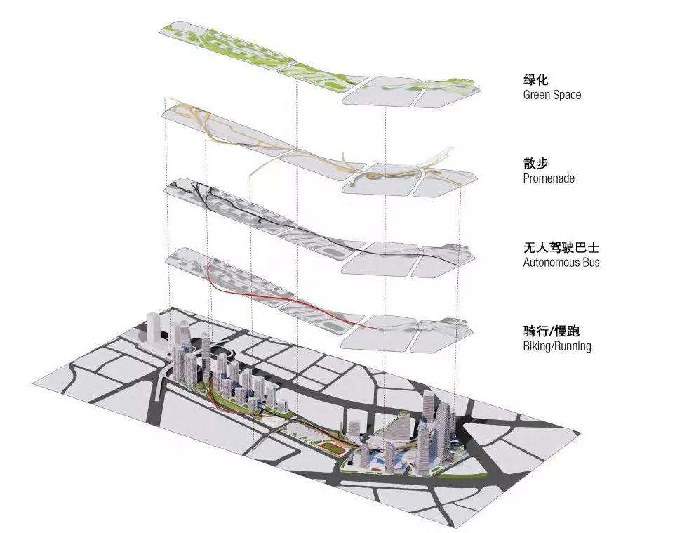 智慧生态圈/ 通过绿色及智能交通系统盘活片区功能组团,连接社区入口,公交站点,滨水区,城市广场及社区中心等开放空间节点;