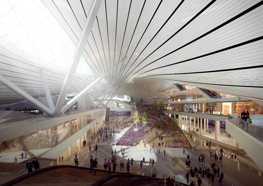 方案强调“建筑即自然”的设计理念,通过打破建筑与景观的界限,实现彼此间的互相渗透,将换成出行、商业办公、文娱休闲融入自然之中,形成多维度的城市田园;将开放空间和绿地归还城市,设计出一座“消失”于山水之间的综合交通枢纽。