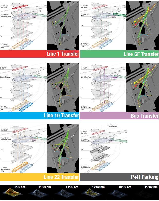 慢行系统犹如潺潺溪流渗透到地铁转换大厅,实现了与盖上景观带的无缝连接,唤醒了地下空间的生机与活力,同时与完善高效的车型道路系统相融相生,呈现出“站城一体”的地铁空间新形态。