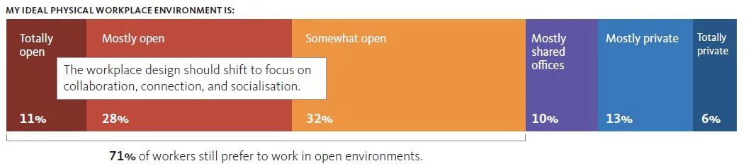 2 020 年 7 月至 8 月, Gensler 对 2500 名英国员工进行了一项工作空间调查。 报告发现,尽管经历新冠病毒疫情,大多数英国员工希望有一个开放式的办公环境作为他们混合工作模式的一部分。 数据显示,超过三分之二的英国员工更偏向于开放式工作空间,而不是更私密的环境。