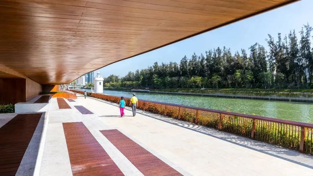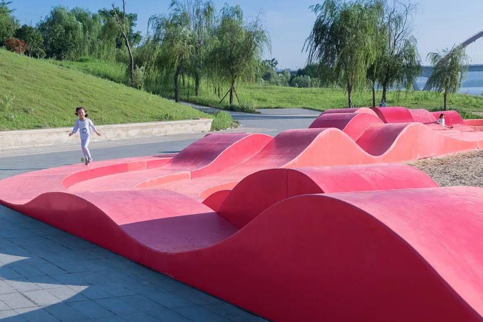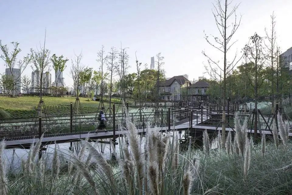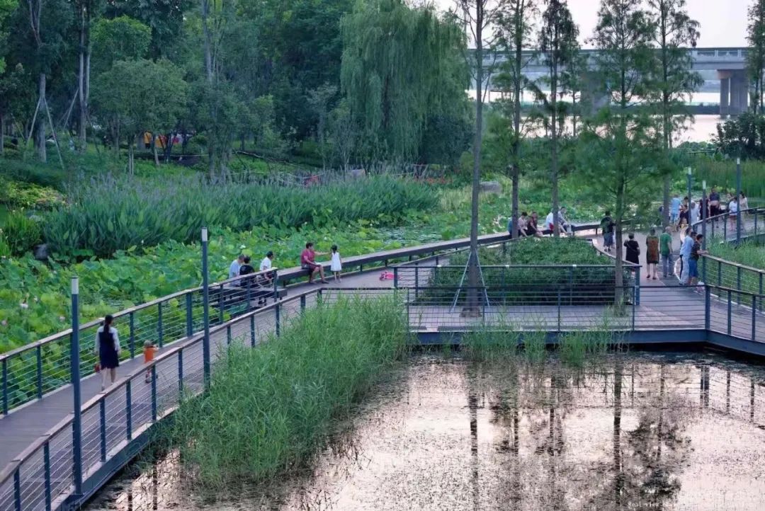 景观以疏林草地为种植模式,配合柔美又具有野趣的观赏草,包括狼尾草及毛冠草等,给人更加清新自然的感受。设计还根据场地现状,沿河打造了不同类型的活动场所,游人可以从不同角度进行看水、亲水、戏水的活动。