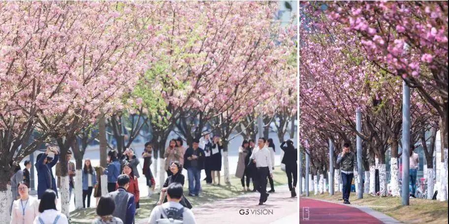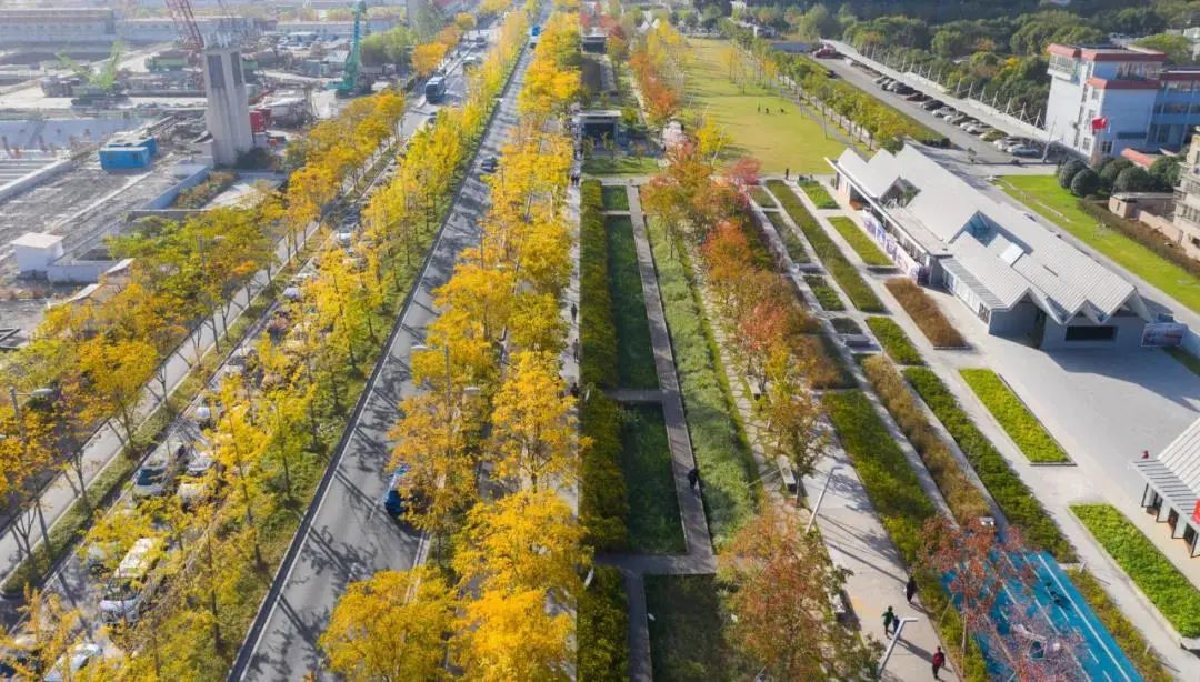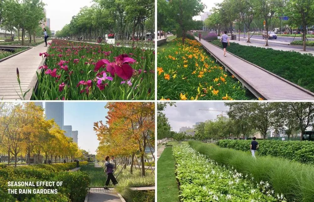 街道以樱花、银杏两大骨干树种勾勒空间边界,运用植物的季相变化营造出春花秋彩的缤纷城市绿廊。同时,项目提供了适应性的雨洪管理解决方案,通过设置雨水花园和下沉式海绵地形,对场地雨水进行渗透、滞留、蓄积和有组织排放,实现了雨水径流的有效管理。