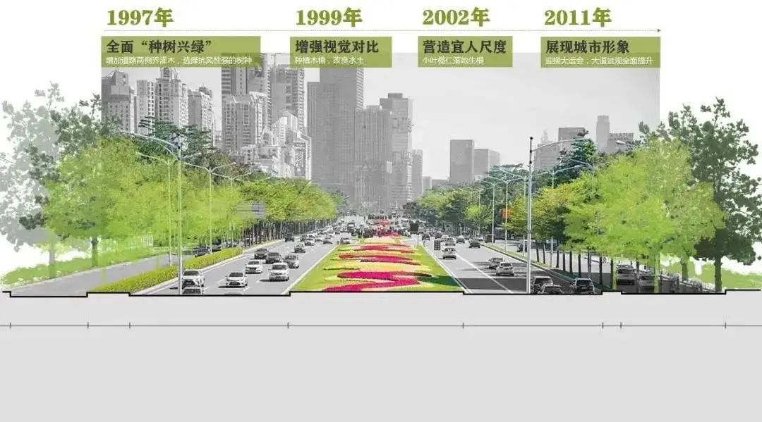 深南大道历经深圳发展变迁的奋争朝夕,40年间从7米宽、2.1公里逐渐建设成为一条百米宽、25.6公里的品质大道。从当年的碎石路面到今天25.6公里的绿色长廊,深南大道演绎了这座城市政治、经济、文化的发展,在这一过程中深南大道也经历着从速度大道——景观大道——活力大道——大道公园的变化与发展。