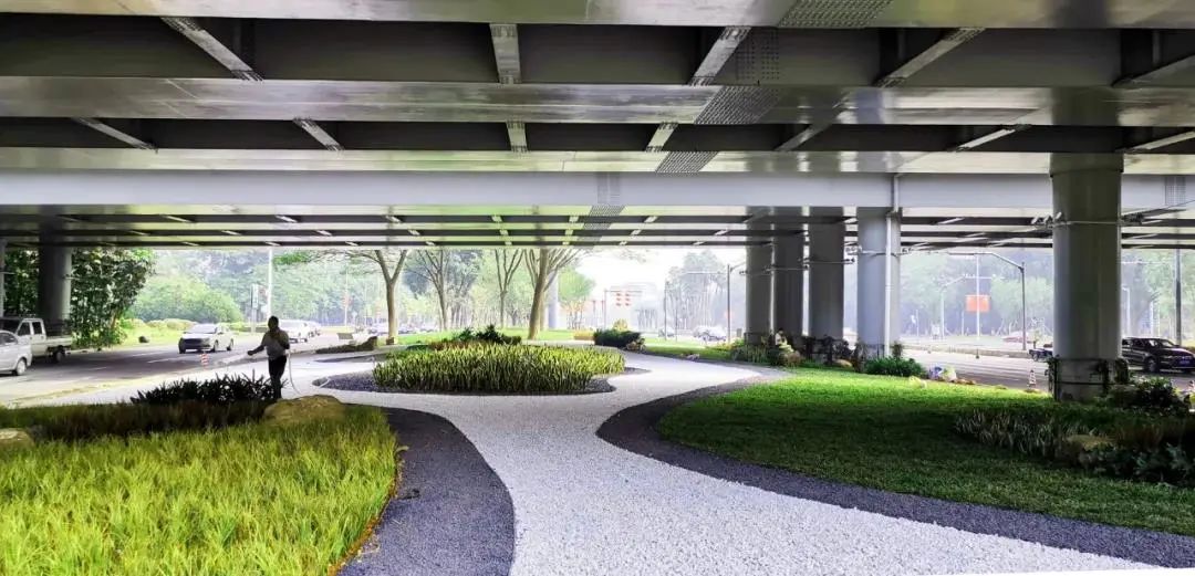 通过在原绿化空间以耐阴植物结合枯山水进行造景,营造生态清雅、可观赏的桥下空间。