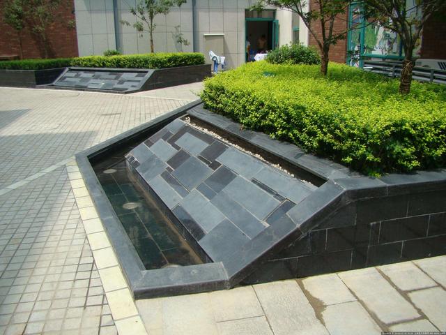 利用花岗岩形成的宽大的两个独立相互错开的阶形平面,跌水通过两个阶形平面的过渡流入水池,上下阶形形状设计的独特固定了水流流式,采用了流线形,整体不失一种亲切感。