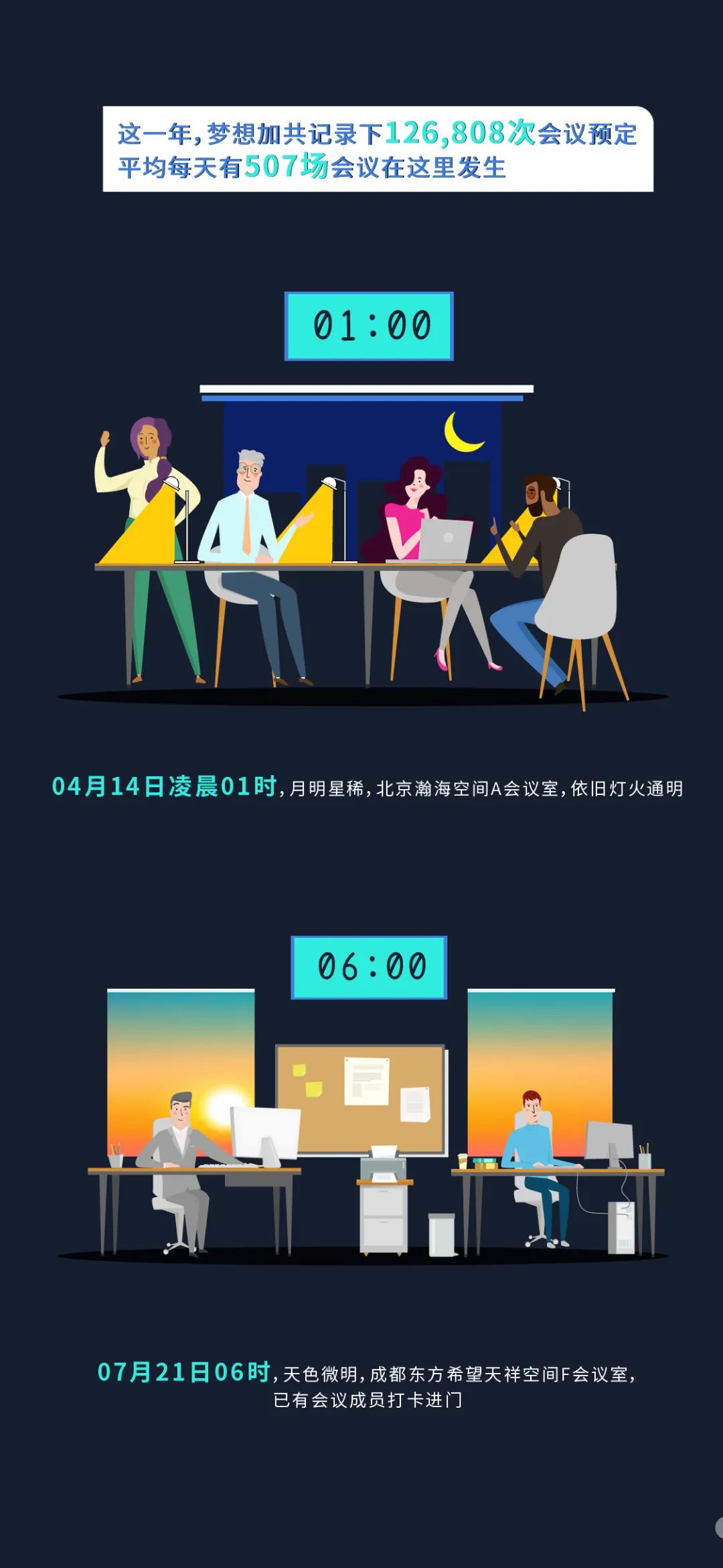 截止到2020年12月31日,梦想加空间累计服务中粮、铂涛集团、腾讯、字节跳动、美团、华为、快手、顺丰、滴滴、雀巢、联想、360、永辉、华谊兄弟、猿辅导、学而思、五粮液、华夏银行、OPPO、蔚来汽车、阿玛尼、科大讯飞、西藏航空、六福珠宝等3500多家企业及团队,整体注册会员超20万。