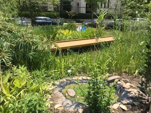 杨浦区伟康路129号对面创智天地旁,一个花木茂盛、鸟雀啁啾、蛙鸣阵阵的"城市微花园"令人无法忽略。工作日中午时分,这座小花园内的勃勃生机常常令路过的白领驻足,而附近的居民则喜欢在清晨和傍晚来这里散步、读书和聊天。
