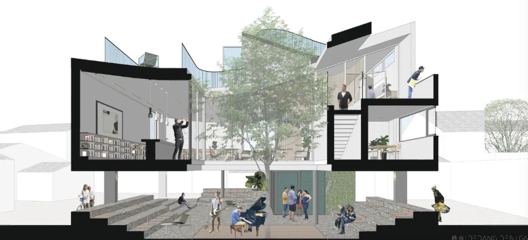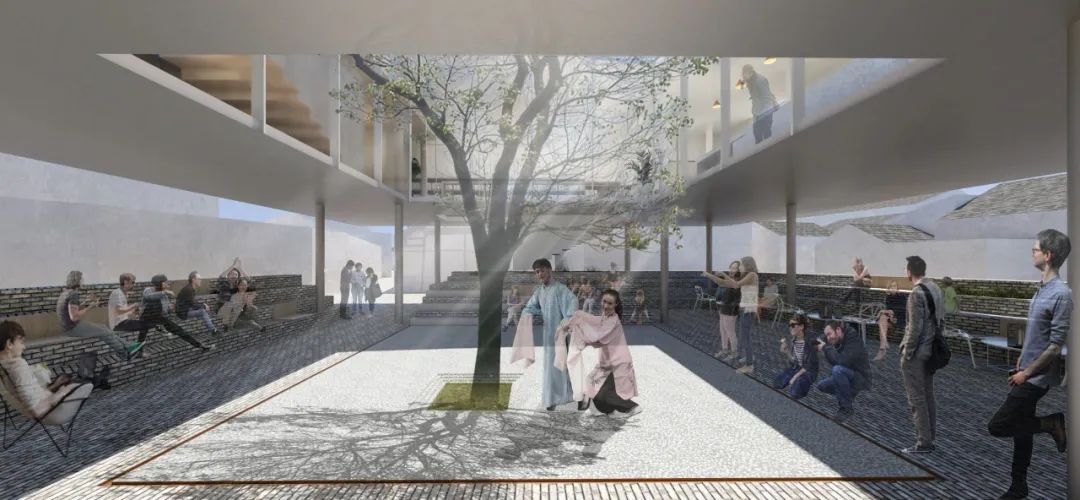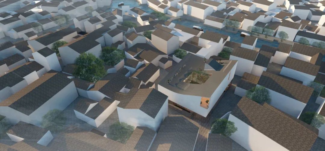 我们就做一个概念,叫“漂浮的客厅”,将一层架空成一个庭院式的空间。同时,在它的屋顶上能看到运河,这个动作很简单,但是它其实传递了一种价值观,让大家从一个非常密集的甚至狭窄的小镇当中跳脱出来,站在一个更高的视野,去感受到这个小镇到底是因为什么而诞生的。所以,我们想通过屋顶让大家能够回看大运河,那是小镇的根,这在以前的小镇环境里面是无法感受到的。