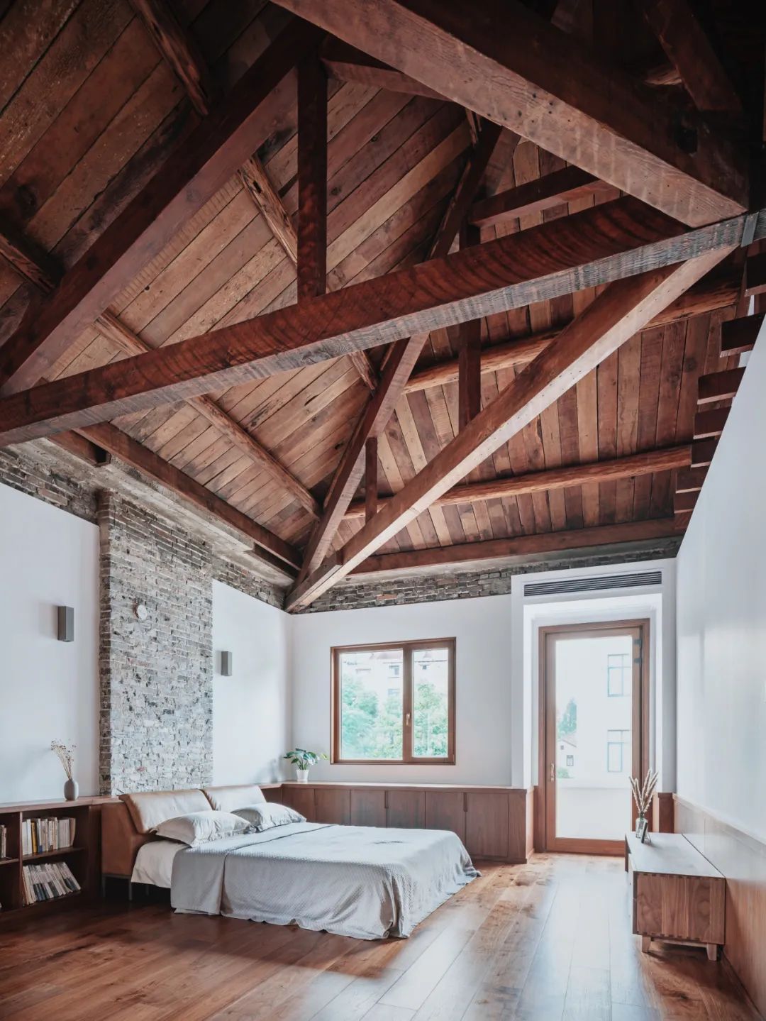 这个房子原有的结构体系,我们把它当成一种历史切片来处理,包括一些物理的切片和影像的切片。物理切片,就是我们保留下来的这些老的房梁,室外的一棵桂花树还有烟囱的烟道等等,有的是直接暴露,有的是做一些比较隐晦的表达,让人能感受到这个房子的历史。