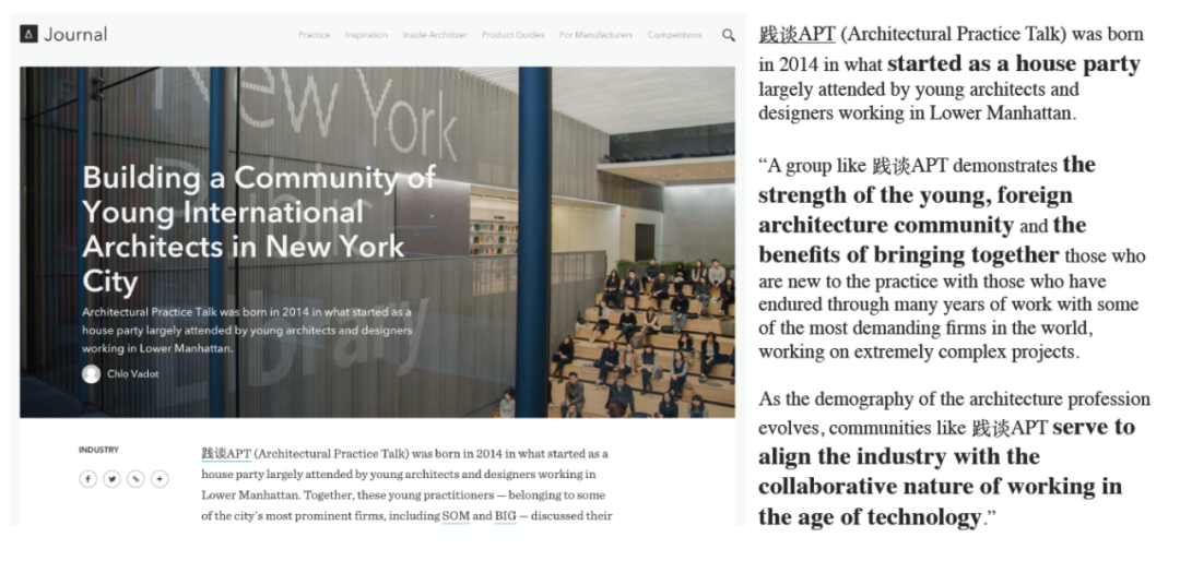 成立“践谈APT”的契机是偶然性的,但是也有一定的必然性。当时越来越多的中国学生去美国留学,他们毕业之后大多数人会涌到纽约来工作。大家都是从最好的这些高校毕业的学生,又在最好的事务所里工作,我希望大家能把自己做的事情互相分享出来,把价值做一个更好地传递和连接。