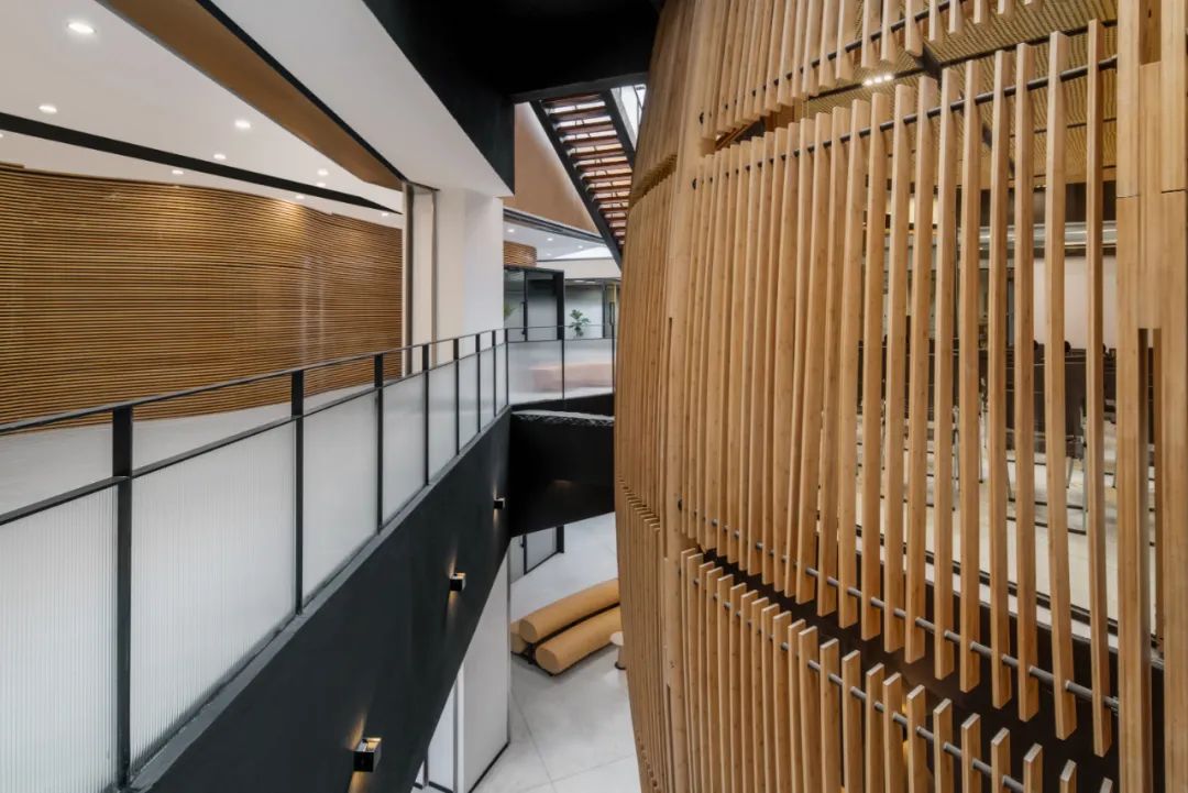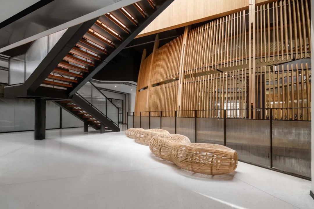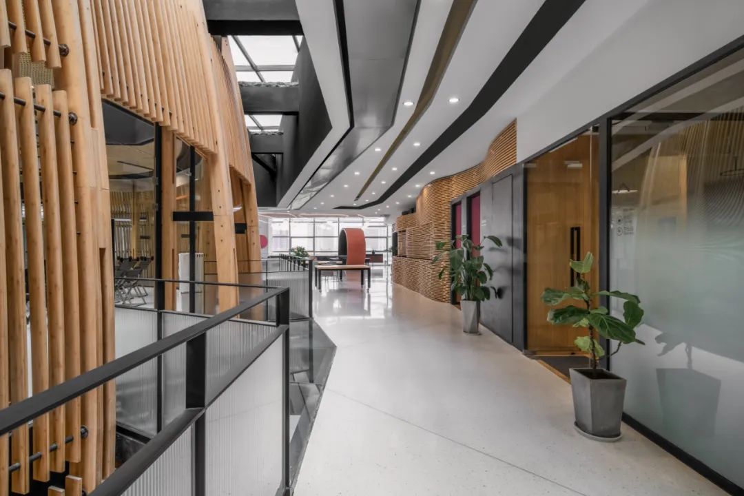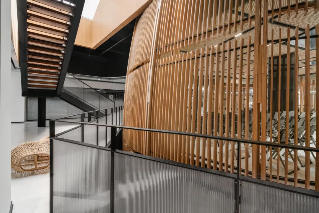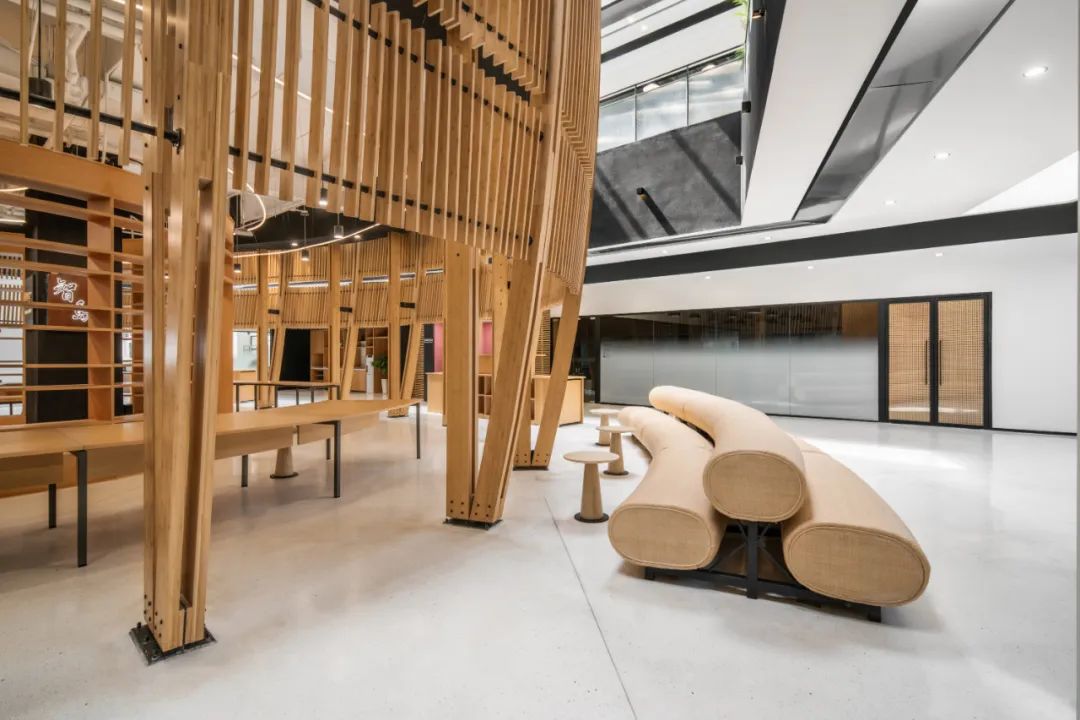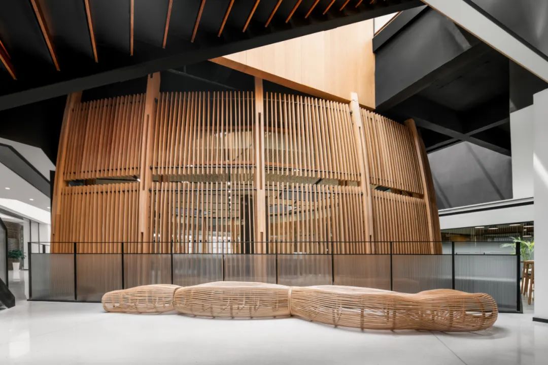 ▼办公区域中庭置入竹材结构,其他空间环绕布局,A woodenstructure is placed in the atrium of the office area, and other spaces aresurrounded by the layout.