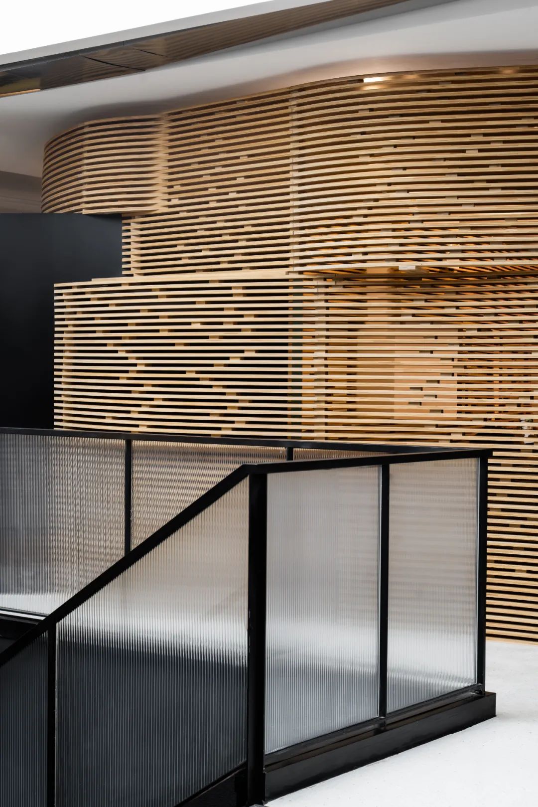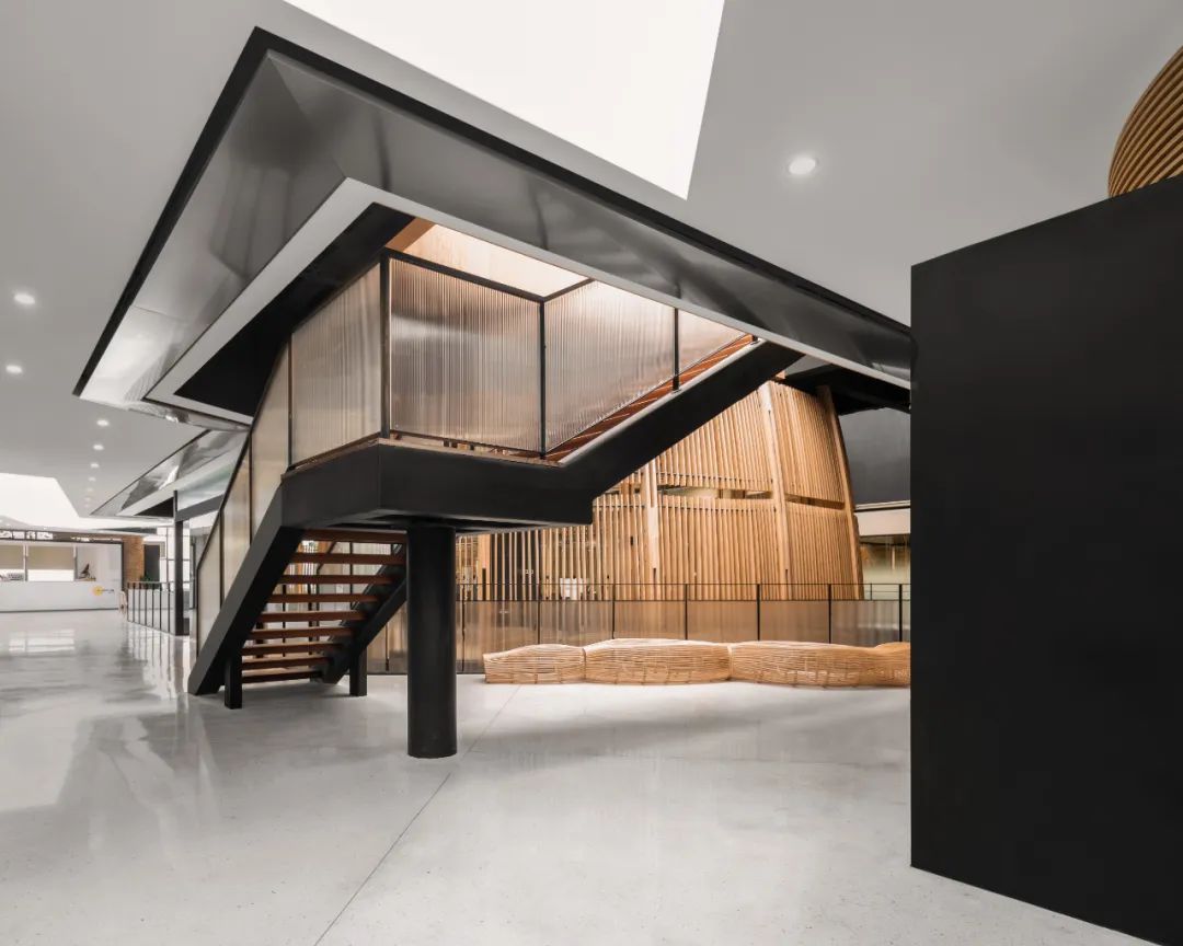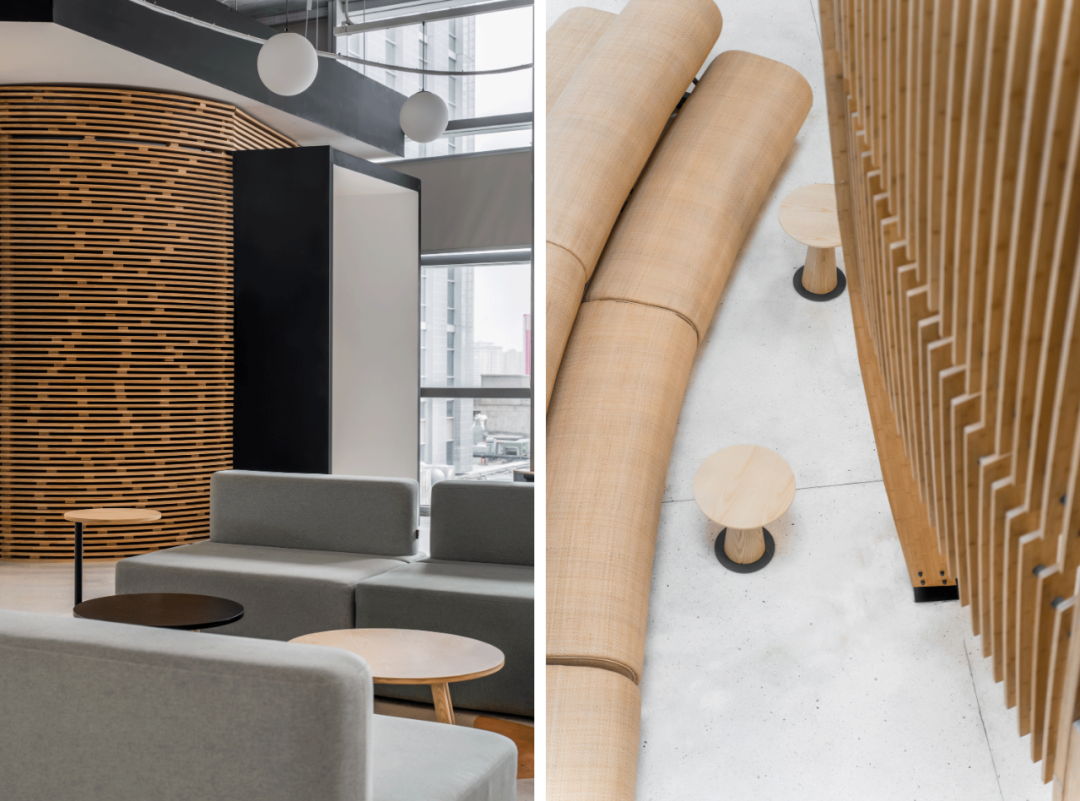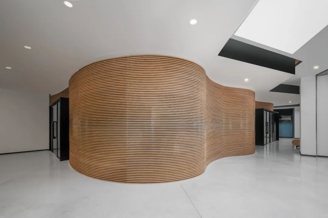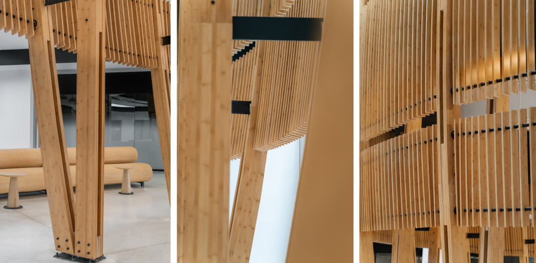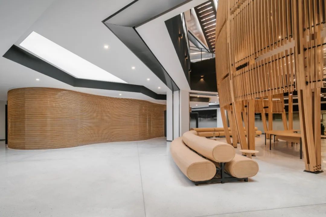 ▼办公区域中庭置入竹材结构,其他空间环绕布局,A woodenstructure is placed in the atrium of the office area, and other spaces aresurrounded by the layout.
